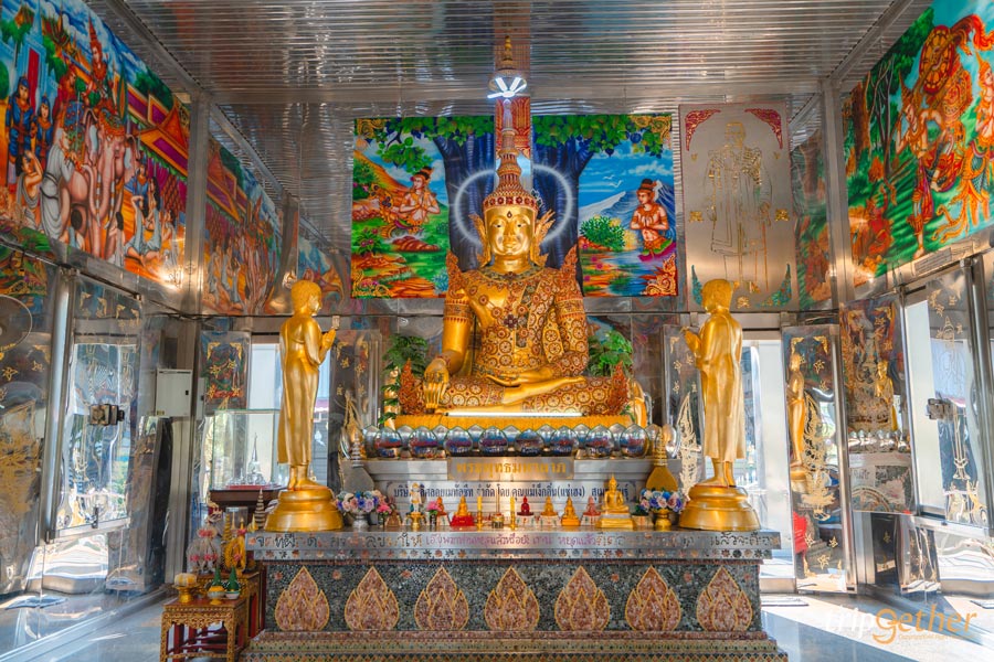 ภายในโบสถ์สแตนเลสเป็นที่ประดิษฐานของพระพุทธมหาลาภ พระพุทธรูปประธานทรงเครื่องจักพรรดิ์ และทั่วทั้งฝาผนังโบสถ์ยังมีภาพเขียนสีทศชาติชาดกสุดวิจิตรงดงามที่ใช้เทคนิคอย่างแอร์บรัชอีกด้วย