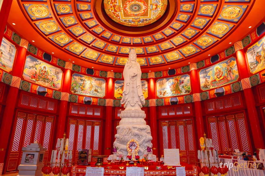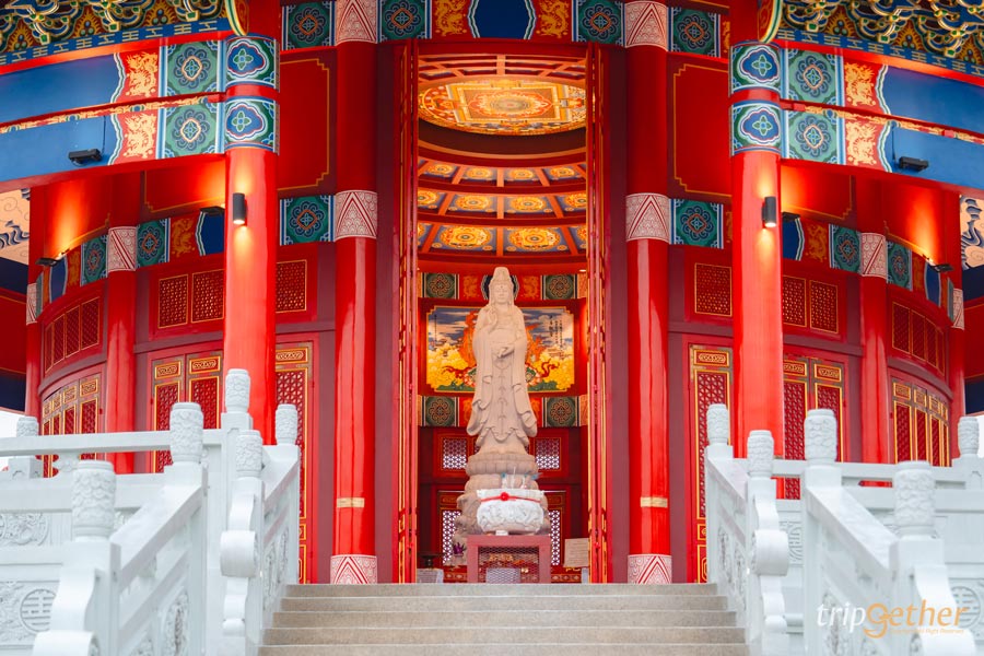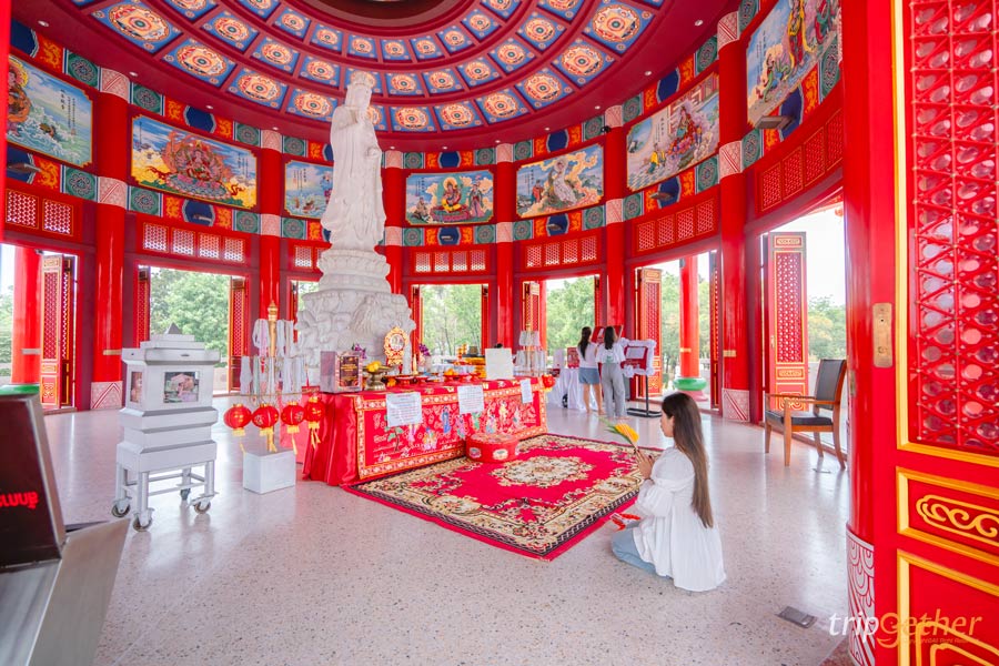 ภายในวิหารเป็นมีลักษณะเป็นโถงวงกลมแบบมีประตูที่ปิด – เปิดได้โดยรอบ เน้นโ?นสีแดงที่เป็นสีมงคลของจีน มีพระโพธิสัตว์กวนอิมปางประทานพรประดิษฐานอยู่ภายใน โดยพระโพธิสัตว์กวนอิมองค์นี้สร้างจากหยกขาวที่ถูกค้นพบในประเทศเมียนมา และได้นำไปแกะสลักเป็นพระโพธิสัตว์กวนอิม จากนั้นจึงได้อัญเชิญมาประดิษฐานที่นี่แล้วสร้างวิหารตามมา เพื่อเป็นสิริมงคลแก่ชาวกบินทร์บุรี