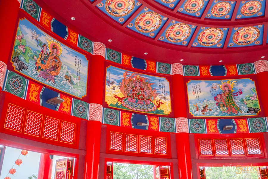 นอกจากนี้ทั่วทั้งภายในของวิหารยังมีลวดลายตามจุดต่างๆ ที่แฝงสัญลักษณ์ของความเป็นมงคลตามความเชื่อ ไม่ว่าจะเป็นภาพจิตรกรรมพระโพธิ์สัตว์กวนอิมปางต่างๆ ถึง 11 ปาง บนยังมีดาวเพดานที่เขียนเป็นภาพมันดาลาที่สื่อถึง มณฑลหรือพื้นที่แห่งการตรัสรู้ จึงทำให้บรรยากาศเต็มไปด้วยความขลังและความศักดิ์สิทธิ์