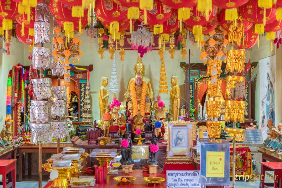 บริเวณหน้าศาล ประดับตกแต่งด้วยโคมสีแดงสไตล์จีน พอเราเข้ามาแล้ว เรามาสักการะพระประธานของศาลเจ้า คือ หลวงพ่อโต หรือ ซำปอกง