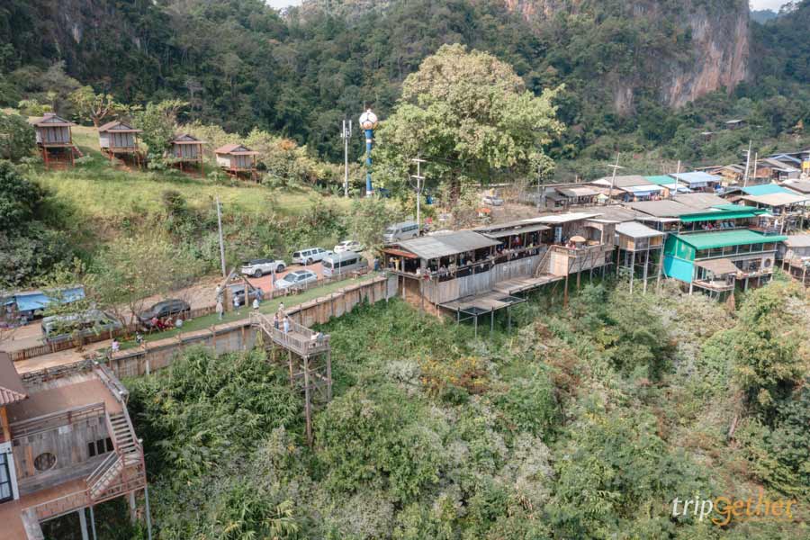 ถ้าพูดถึง หมู่บ้านจ่าโบ ใครๆ ต่างก็ต้องนึกถึง ร้านก๋วยเตี๋ยวห้อยขา เพราะเป็นไฮไลท์ที่เรียกได้ว่ามาแล้วต้องแวะ! แทบจะเป็นแลนมาร์คของที่นี่เลยก็ว่าได้ พิกัดร้านตั้งอยู่บริเวณหน้าหมู่บ้าน ตัวร้านเป็นเพิงไม้เรียบง่ายตั้งอยู่บนเนินเขา ภายในร้านมีที่นั่งให้เลือกเยอะมาก ไม่ว่าจะนั่งโต๊ะ นั่งห้อยขาหรือเป็นเปลตาข่ายก็มีนะ