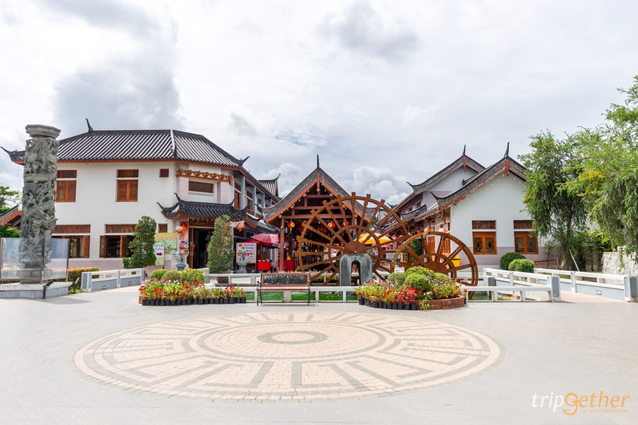 เริ่มต้นด้วยโซนหมู่บ้านมังกรสวรรค์ที่บริเวณหน้าหมู่บ้านจะมีกังหันพ่อลูกอันเป็นเอกลักษณ์ของเมืองลี่เจียง ซึ่งที่หมู่ก็จำลองกังหันเอาไว้ด้านหน้าได้อย่างสวยงาม จุดนี้เป็นจุดเช็คอินแรกที่ต้องไปเก็บภาพไว้ และก่อนจะไปเดินเล่นถ่ายรูป ชมหมู่บ้าน ขอแนะนำให้เติมพลังกันก่อนจะได้มีแรงโพสต์ท่า ที่หมู่บ้านมังกรสวรรค์แห่งนี้มีทั้งร้านอาหาร โรงเตี๊ยม เกาเหลาก๋วยจั๊บ ร้านเครื่องดื่ม ขนม ของฝากและร้านขายของที่ระลึก ซึ่งทั้งหมดนี้ตกแต่งภายนอกภายในสไตล์จีน เผลอๆ แค่แวะกินข้าวก็ได้ภาพชนะแคมเปญแล้ววว