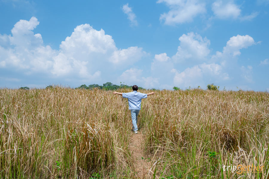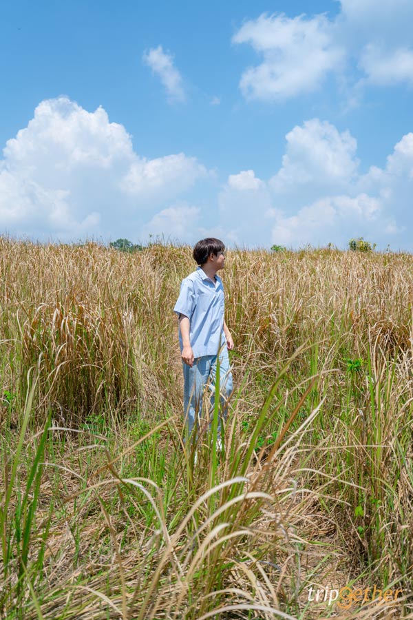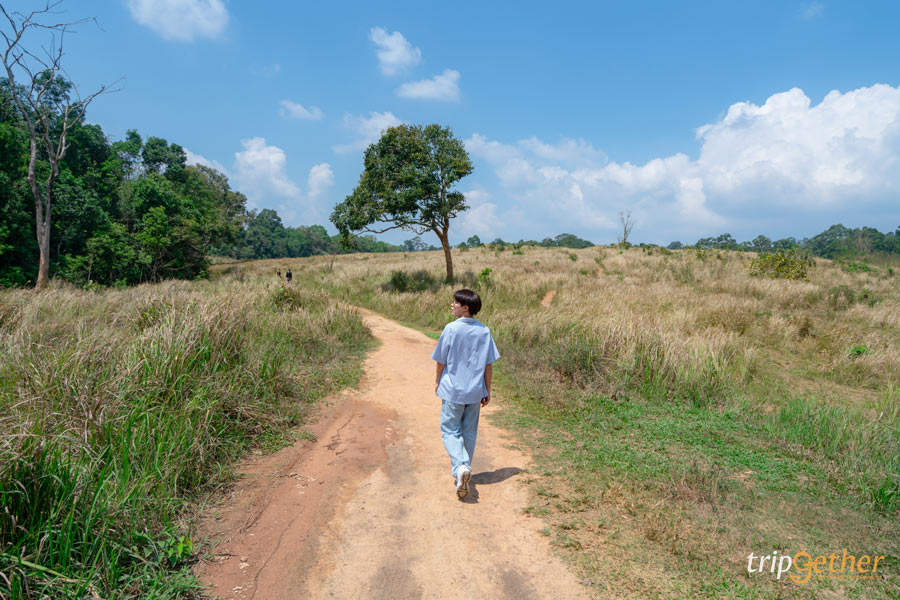 ระหว่างทางสามารถแวะเข้าไปถ่ายรูปน่ารักๆ กลางทุ่งหญ้าได้อีกด้วย โดยเกือบตลอดทั้งเส้นทางจะมีทุ่งหญ้าให้ได้ชมกันแบบเพลินๆ ถึงแดดจะร้อน แต่ลมที่พัดมาจากป่าและภูเขา เย็นสบายมากๆ (แนะนำว่าถ้าใครมาช่วงกลางวัน ควรพกร่ม หรือน้ำดื่มมาด้วยนะ)