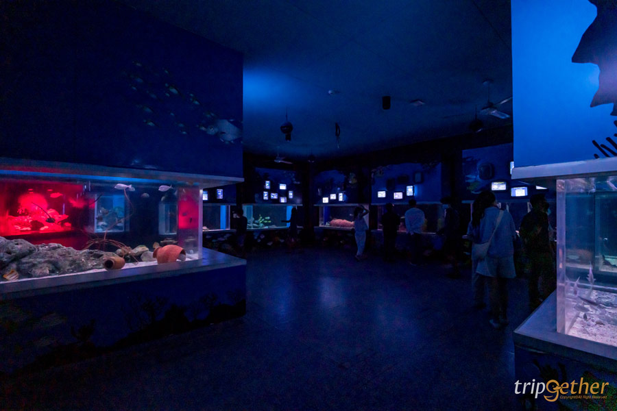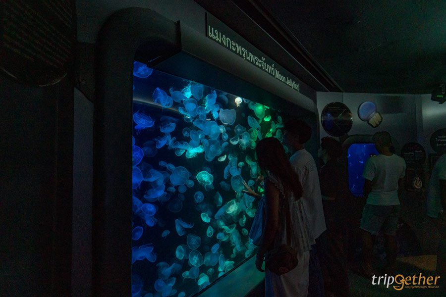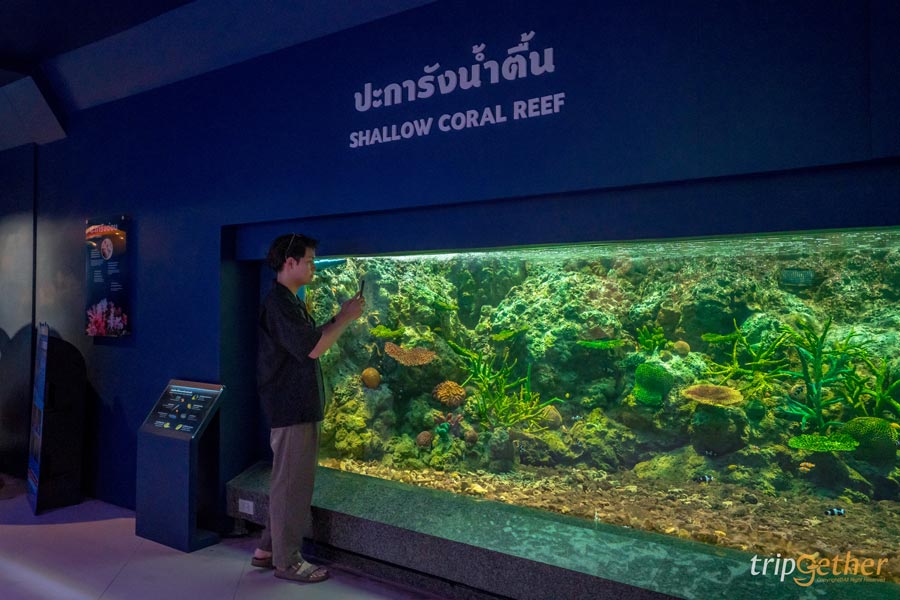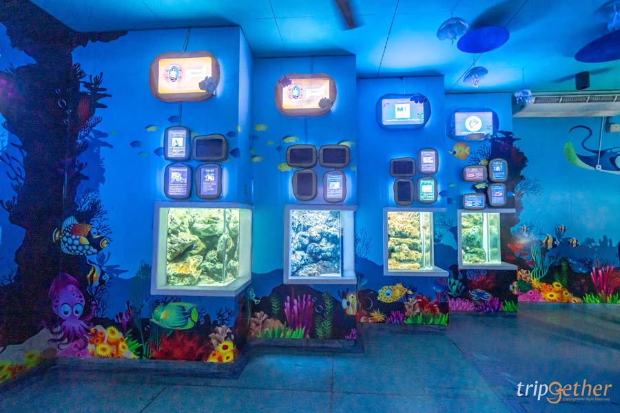 หลังจากที่เราซื้อตั๋วเข้าชมกันแล้ว เรามาเริ่มต้นที่โซน สถานเลี้ยงสัตว์น้ำเค็ม เป็นส่วนจัดแสดงให้ความรู้เกี่ยวกับสิ่งมีชีวิต สัตว์ทะเลชนิดต่างๆ ของน่านน้ำไทย และจำลองสภาพแวดล้อมชายฝั่งซึ่งเป็นแอ่งน้ำขึ้น – น้ำลง เดินดูเพลินๆ เลย