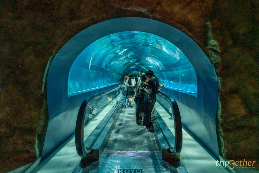 และแล้วเราก็เดินเข้ามาลอด อุโมงค์ปลาทะเลขนาดใหญ่ยักษ์ ความยาว 37 เมตร ลึก 13 เมตร มาชมโลกใต้ทะเลแบบใกล้ชิด