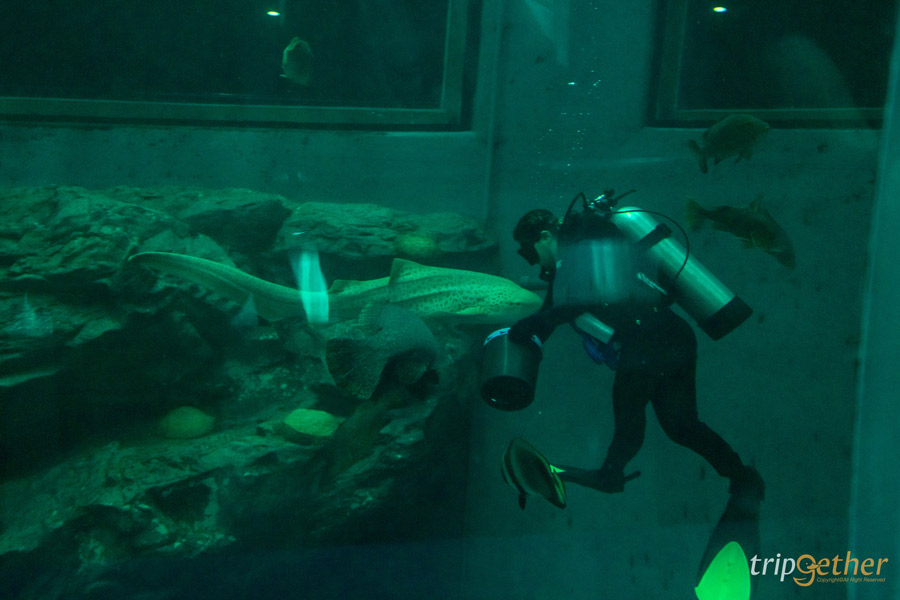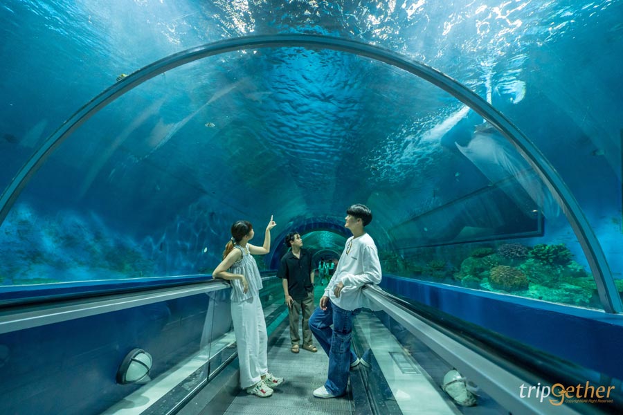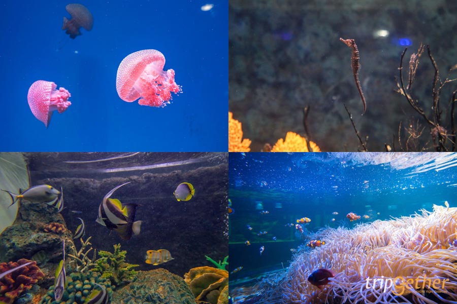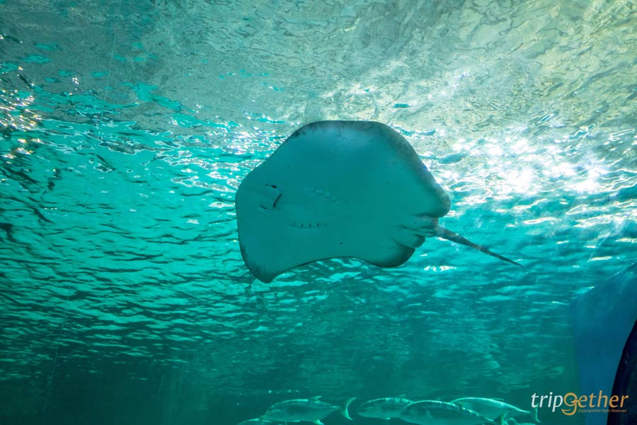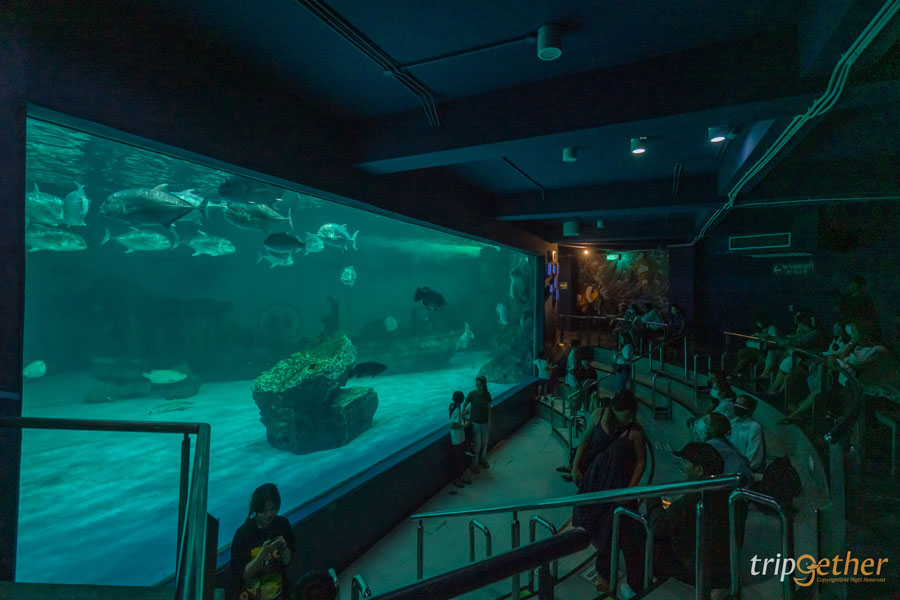 บรรยากาศภายในนี้จะมืดสักหน่อย ทำให้เรามองเห็นน้องๆ ได้สวยงาม ชัดเจน จากนั้นเรามาเดินดูปลายักษ์ใต้มหาสมุทรกัน ซึ่งจะมีทั้งปลาใหญ่ ปลาเล็กอยู่ร่วมกัน แล้วเราก็เห็นปลาที่เราคุ้นเคยหลายตัว