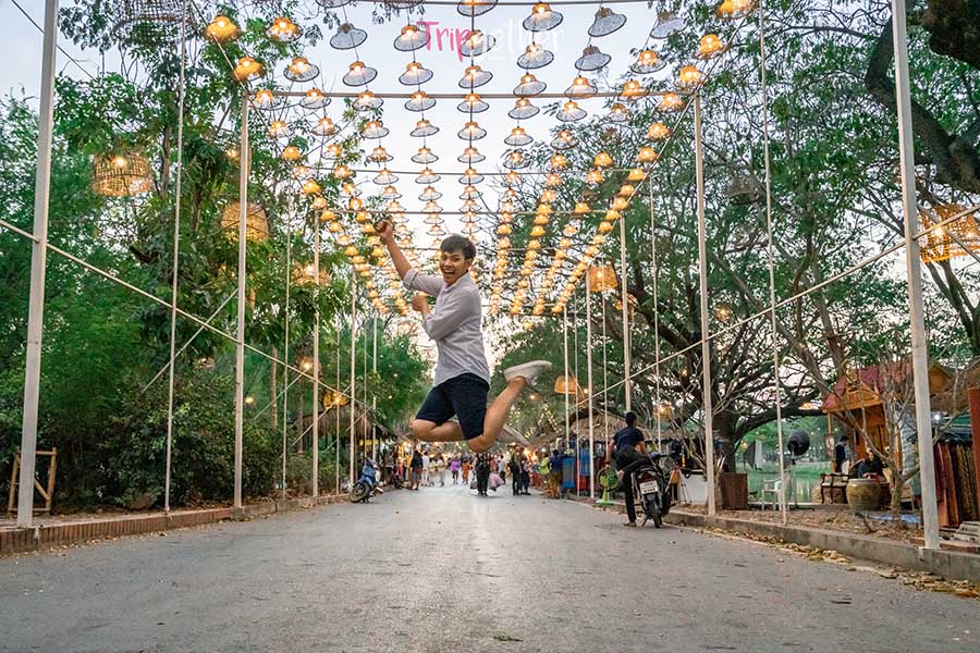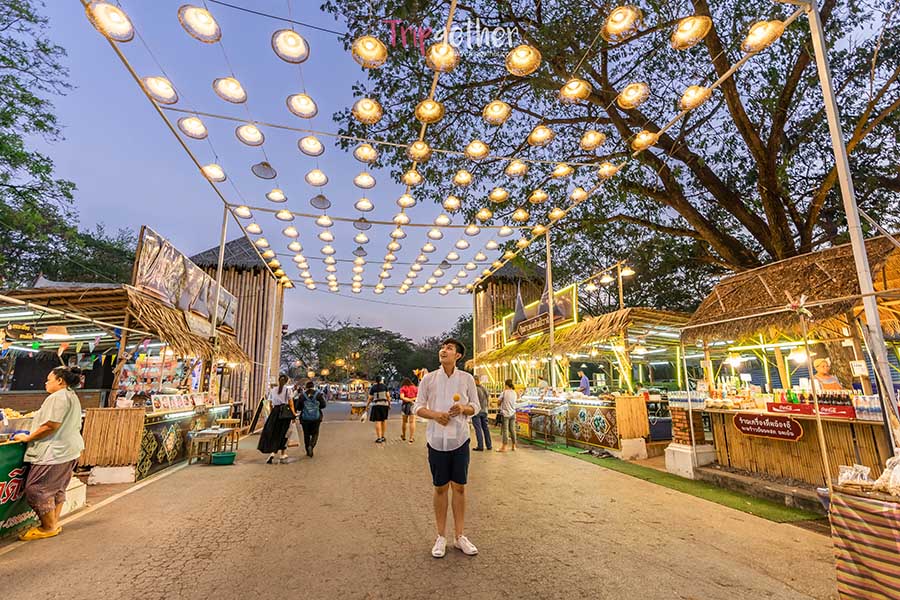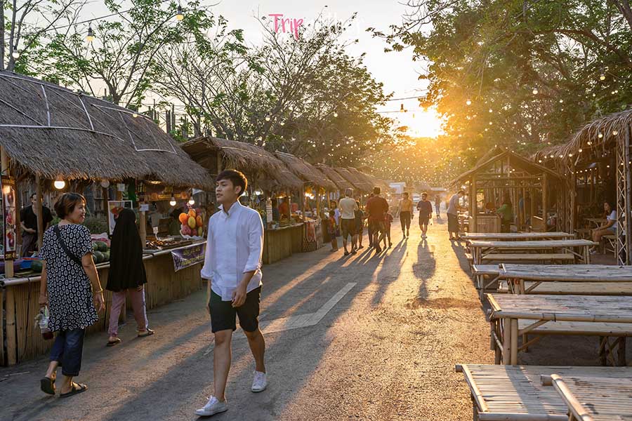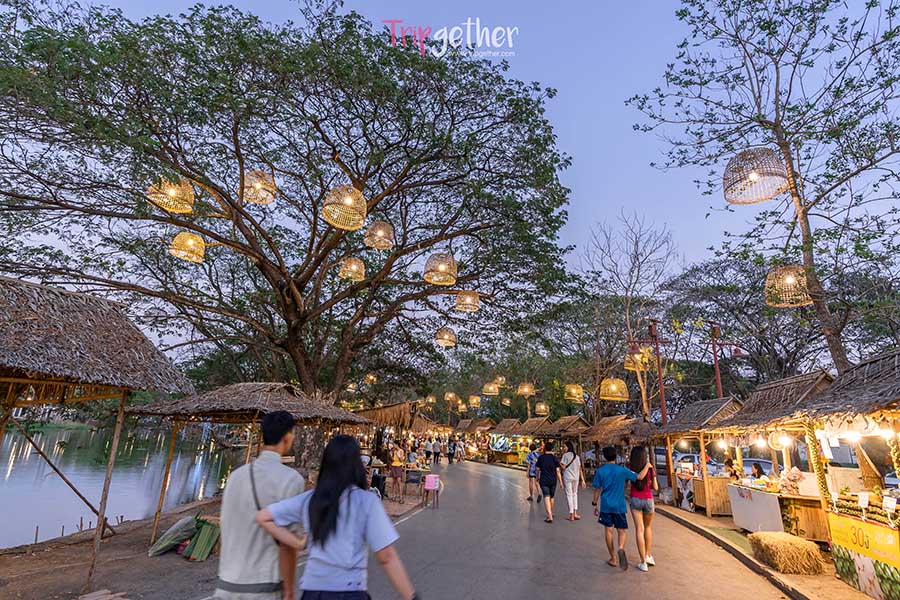 บรรยากาศภายในตลาดค่อนข้างน่ารัก มากมายด้วยมุมสวยๆ ที่ส่วนใหญ่จะใช้อุปกรณ์เครื่องจักสานเดิมๆ มาตกแต่งได้อย่างเป็นเอกลักษณ์ อย่างโคมที่ทำจากสุ่มไก่ที่คอยส่องแสงสว่างตลอดเส้นทางนับพันใบ ภายในตลาดมากมายด้วยร้านค้าที่เป็นทางยาวสองฝั่ง เดินกันแบบเพลินๆ ดูแล้วไม่น่าต่ำกว่า 100 ร้าน
