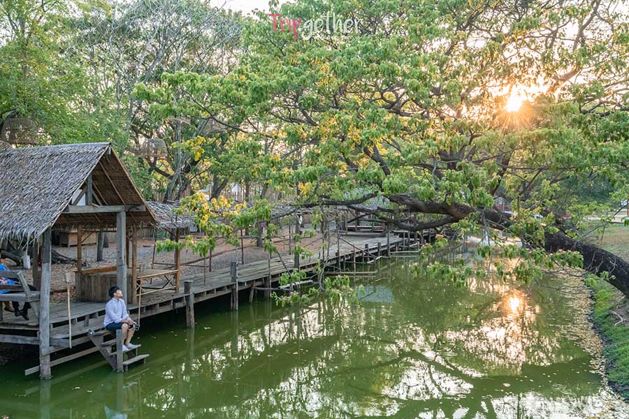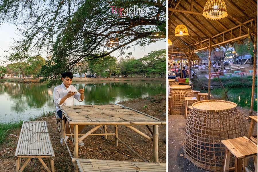 ส่วนมุมนั่งกิน นั่งพักก็มีเยอะ กระจายไปยังมุมต่างๆ ทั้งไม้ไผ่ใต้ต้นไม้ กระท่อมบนโต๊ะสุ่มไก่ก็เก๋ไม่เบา