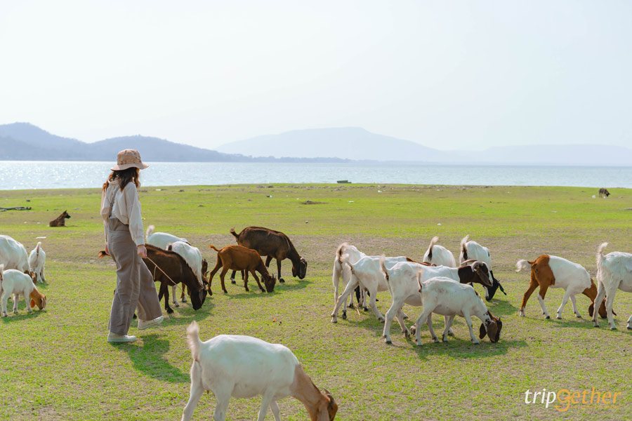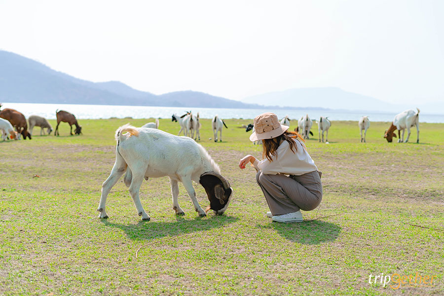 ไฮไลท์ที่ใครมาก็ต้องหลงใหลกับความน่ารักของฝูงแพะตัวน้อยๆ ถือว่าเป็นกิจกรรมที่สายคอนเทนต์จะต้องมาถ่ายรูปคู่ด้วย แพะเหล่านี้เป็นแพะที่ถูกเลี้ยงโดยชาวบ้านแถวนั้น ซึ่งน้องจะถูกปล่อยออกมาหาหญ้ากิน 2 ช่วง คือ ช่วงเช้าประมาณ 08.00 – 11.00 น. และช่วงบ่ายประมาณ 14.00 – 17.00 น. โดยฝูงแพะนี้จะเดินเล็มหญ้าไปเรื่อยๆ เราอาจจะต้องหาจังหวะ ค่อยๆ เดินเข้าไปถ่ายรูป แนะนำว่าถ้าอยากได้รูปสวยแบบเห็นฝูงแพะเยอะๆ ให้นำอาหารอย่างพวกหญ้าแห้งติดมาด้วย รับรองน้องเดินรุมเข้ามาหาแน่นอน