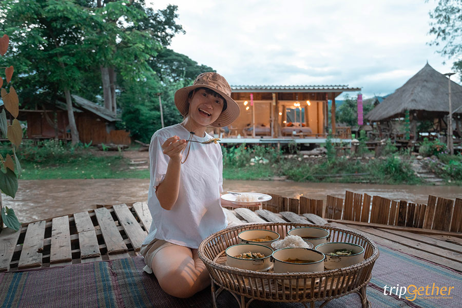 ล่องแพกันเต็มอิ่มแล้ว เรากลับมายัง บ้านวังริมคอง โฮมสเตย์ ที่พักของเราในค่ำคืนนี้ สำหรับที่พักจะรวมอาหารเช้า และอาหารเย็นเรียบร้อย ไม่ต้องหิ้วเสบียงมาเองให้หนักกระเป๋า โดยเมนูอาหารจะเป็นเมนูพื้นบ้านง่ายๆ แต่อร่อย เพราะได้กินท่ามกลางธรรมชาติสวย ฟังเสียงแม่น้ำคองไหล ทำให้อาหารเย็นวันนี้อร่อย และมีอรรถรสมาก
