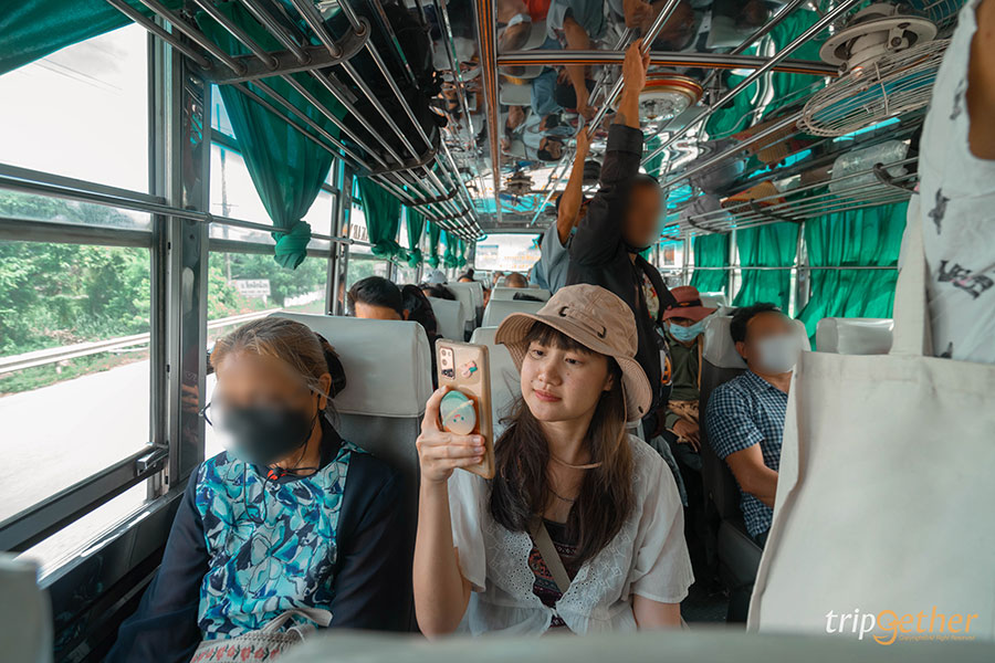 รถเมล์ที่เราเลือกในทริปนี้เป็นรถพัดลม รับลมธรรมชาติ ชิลล์ดี บรรยากาศภายในรถวันนี้คนเต็มคันรถ มีทั้งนั่ง และยืนด้วย