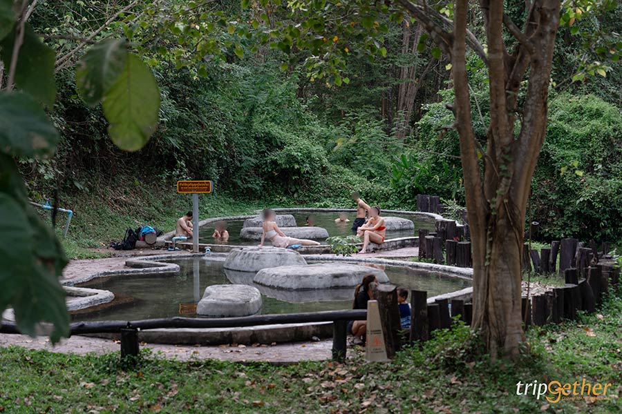 บ่อน้ำร้อนมีหลายจุด อุณหภูมิของน้ำก็จะแตกต่างกัน ยิ่งเดินไกล ยิ่งร้อนน้อยลง