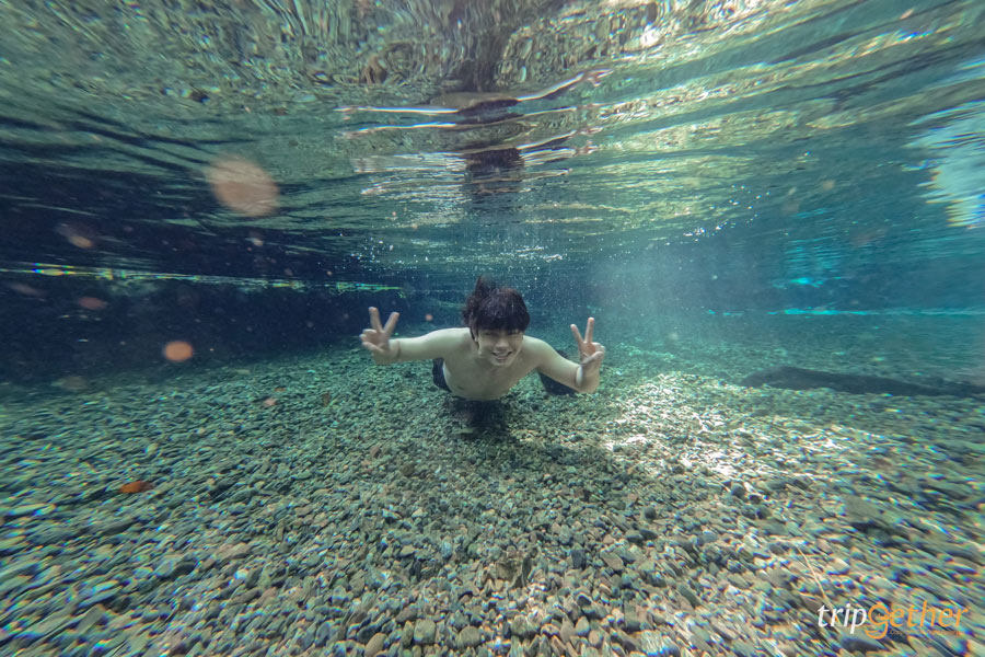 ที่เป็นไฮไลท์เลยก็คือน้ำที่ออกเป็นสีฟ้าและใสมาก เมื่อมองจากด้านบนผิวน้ำก็สามารถมองเห็นพื้นกรวดหินด้านล่างได้แบบชัดเจน ในขณะเดียวกันถ้าดำน้ำลงไป ทั่วทัะ้งบ่อน้ำพุร้อนก็จะเป็นสีฟ้าแกมเขียว บอกเลยว่าได้รูปสวยๆ เพียบ