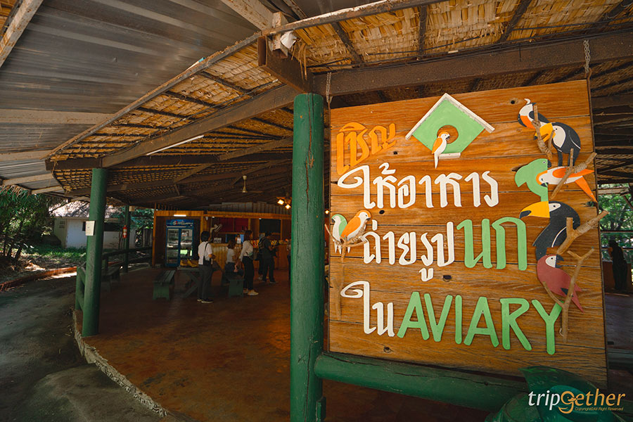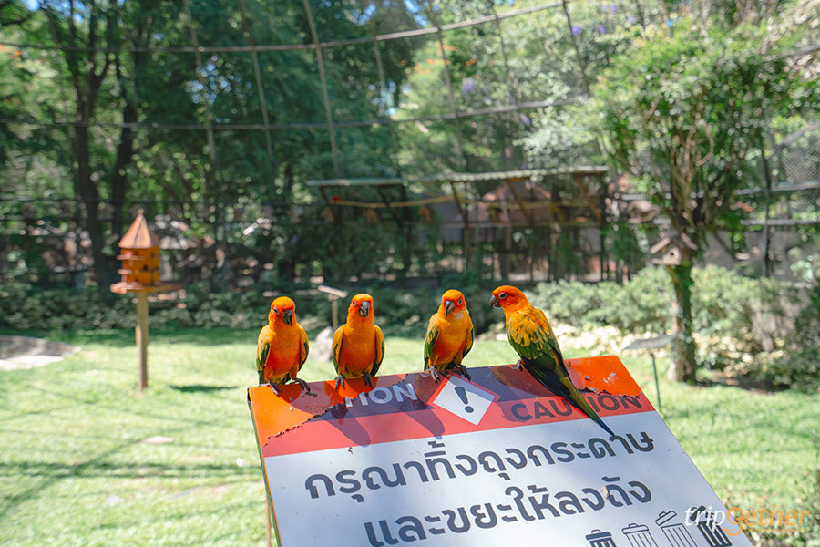 เริ่มจากโซนให้อาหารและถ่ายรูปคู่กับนก เดินเข้ามาจะเจอกับสีสันความสดใสของนกซันคอนัวร์ตัวน้อยๆ ที่บินอวดโฉมไปมา และที่สำคัญน้องแสนรู้มา ถ้าเห็นใครถืออาหารเข้ามาจะรีบบินมาเกาะขออาหารเลย ซึ่งอาหารที่เราสามารถให้ได้ก็คือเมล็ดทานตะวัน แนะนำว่าให้เทมาวางไว้บนมือ แล้วน้องจะบินมากินเอง หรือถ้าอยากให้นกมาเกาะตรงไหนก็เทอาหารไว้ตรงนั้นเลย ในโซนนี้นอกจากจะสนุกกับการให้อาหารนก ยังได้ถ่ายรูปสวยๆ ด้วย