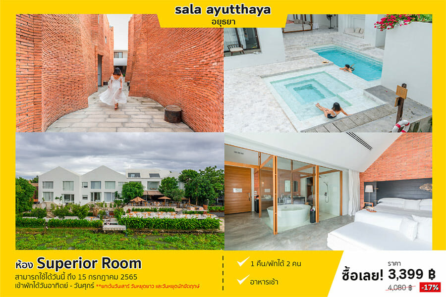 ศาลาอยุธยา (sala ayutthaya) ที่พักหรูระดับ 5 ดาว เครือ SALA Hospitality Group ในบรรยากาศแสนเงียบสงบ ตั้งอยู่ใจกลางเมืองอยุธยา ออกแบบโดยใช้สถาปัตยกรรมไทยผสมผสานสถาปัตยกรรมยุคสมัยใหม่ มีการจัดวางตัวอาคารอย่างเรียบหรูจัดสรรพื้นที่ใช้สอยได้อย่างลงตัวทุกองศา มาพร้อมการบริการที่ดีและสิ่งอำนวยความสะดวกสบายที่ครบครัน เหมาะแก่การมาพักผ่อนนอนชิลล์ในวันหยุด ที่สำคัญสายถ่ายรูปเช็คอินจะต้องเลิฟเพราะบริเวณที่พักมีมุมให้ถ่ายรูปกดชัตเตอร์กันแบบรัวๆ