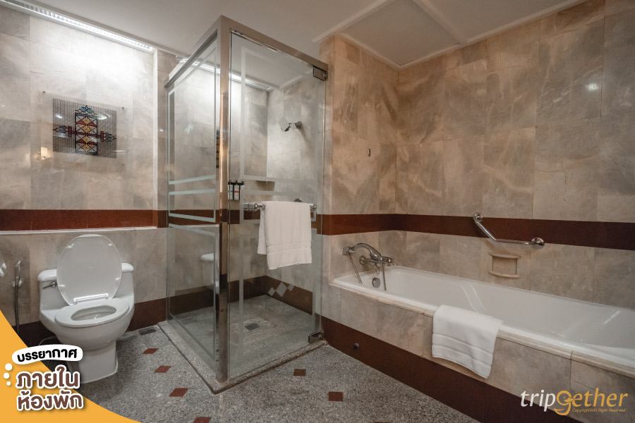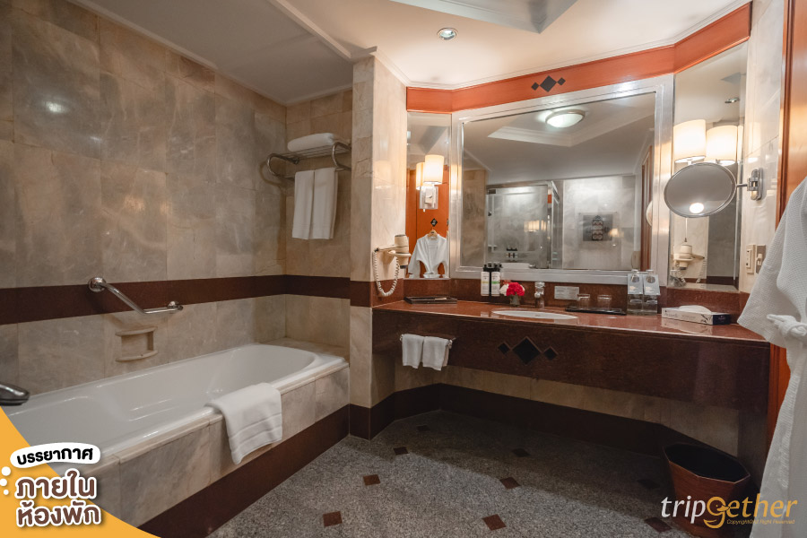 ห้องน้ำมีอ่างอาบน้ำให้นอนแช่ผ่อนคลายและยังครบครันด้วยสิ่งอำนวยความสะดวกอีกเพียบ