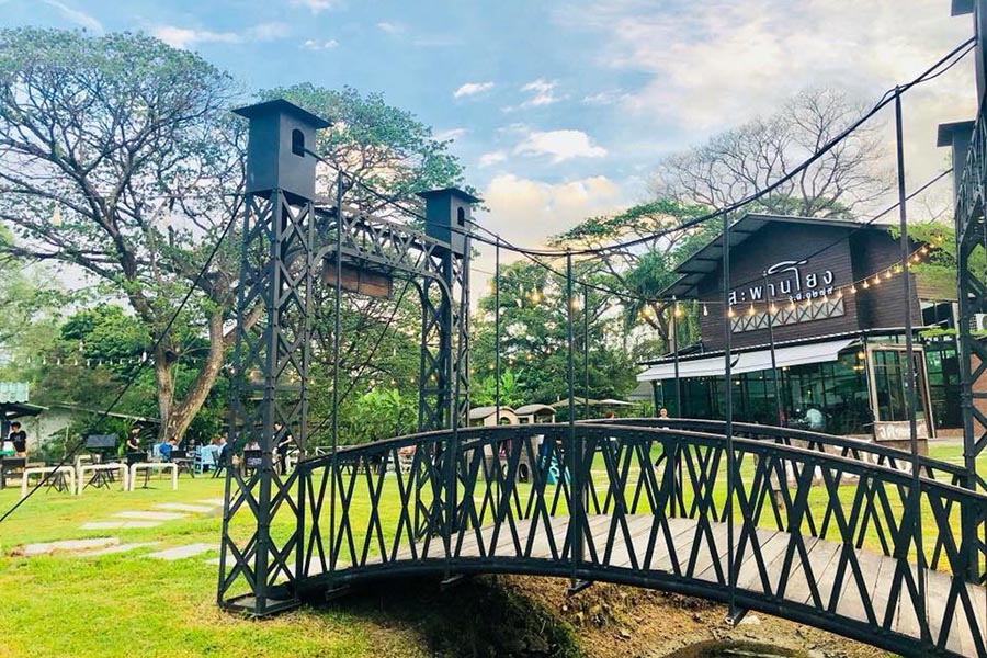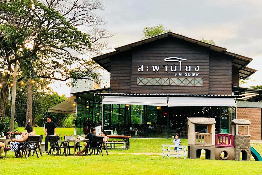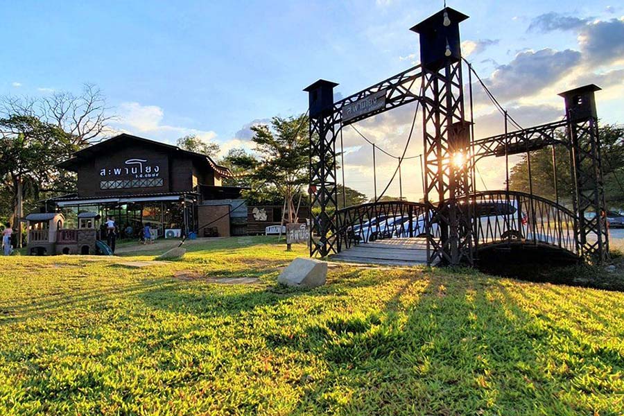 สะพานโยง จ.ศ ๑๒๗๙ ร้านบรรยากาศดีที่ตั้งอยู่ในอำเภอเมืองนครปฐม และยังตั้งอยู่ไม่ไกลจากพระราชวังสนามจันทร์ บรรยากาศรอบๆ ร้านเต็มไปด้วยต้นไม้ให้คอยให้ความร่มรื่นและที่สำคัญตัวร้านตั้งอยู่ติดริมแม่น้ำ สำหรับตัวร้านก็ตกแต่งด้วยสไตล์อินดัสเทรียลโชว์อิฐแบบดิบๆ ซิกเนเจอร์ของทางร้านก็คือ สะพานโยง ที่จำลองมาจากสะพานรามประเวศน์ที่สร้างตั้งแต่สมัยรัชกาลที่ 6 เท่านี้ยังไม่พอเพราะที่นี่มีโซนเปิดใหม่ได้ไม่นานคือทุ่งนาสะพานโยงที่มีสะพานไม้ทอดยาวไปสู่กลางท้องทุ่ง สำหรับเมนูของทางร้านก็มีทั้งของหวานมากมายทั้งเค้กและเครื่องดื่ม และของคาวให้เลือกอีกหลายเมนู ใครที่กำลังมองหาคาเฟ่สไตล์เท่ๆ แถมมีทุ่งนาให้ชมต้องมาที่นี่เลย
