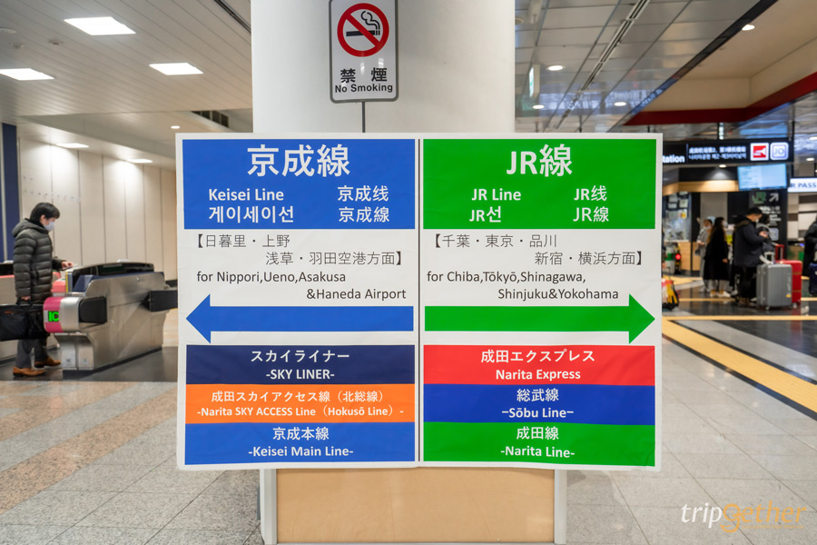 เมื่อถึงสนามบินนาริตะแล้ว เราสามารถเดินตามป้ายบอกทางมาเรื่อยๆ ได้เลย เพราะสถานีรถไฟฟ้าจะอยู่ภายในสนามบิน จากนั้นก็ซื้อตั๋วหรือบัตรแบบเหมาจ่ายที่เจ้าหน้าที่หรือตู้กดตั๋วได้เลย ในส่วนของขบวนรถที่นั่งเข้าโตเกียวก็จะมีให้เลือกหลากหลายสาย ซึ่งจะมีหลักๆ คือ รถไฟฟ้าสาย Keisei และ รถไฟฟ้าสาย JR