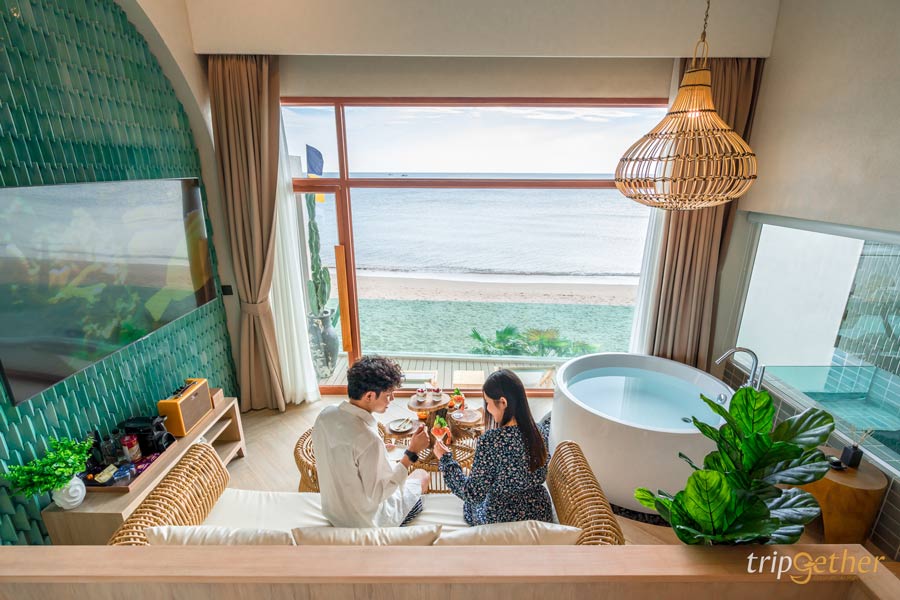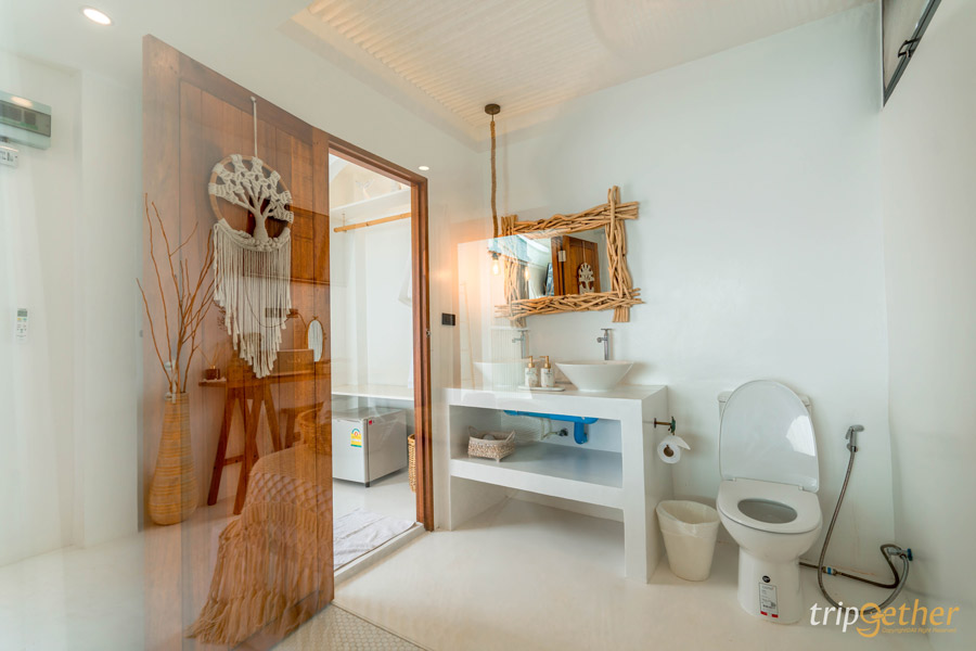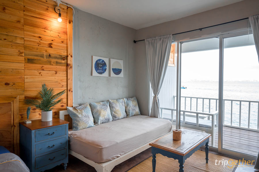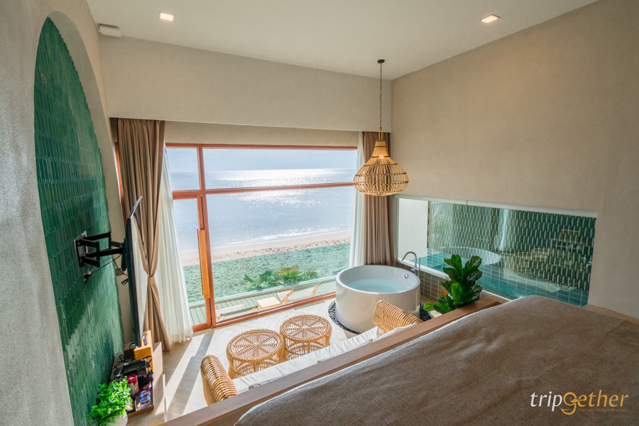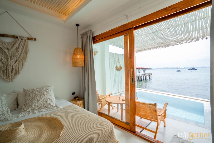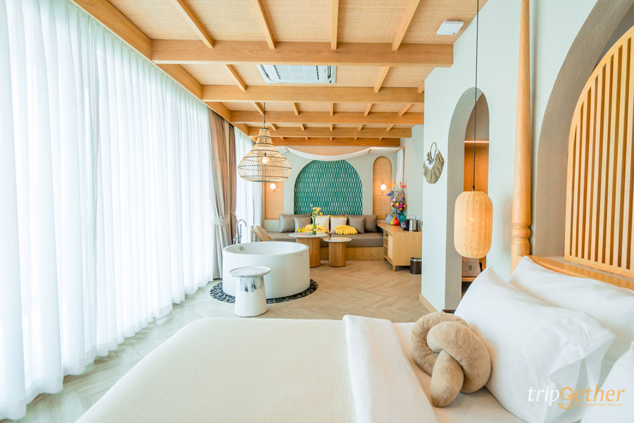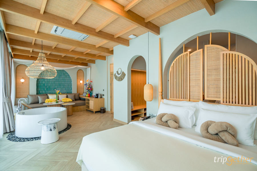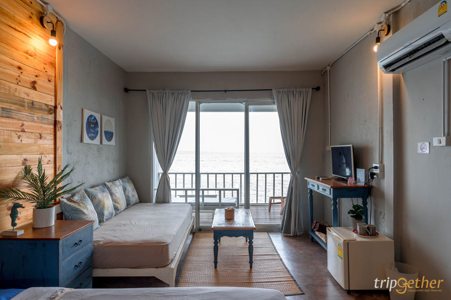 ที่พักสีขาว ริมทะเลจันทบุรี มัลดีฟส์ บีช รีสอร์ท ห้องพักที่นี่มีให้เลือกหลายแบบ เน้นคุมโทนสีขาวตัดกับลายไม้ ทำให้ดูกว้างขวางน่าพักผ่อน สามารถนอนดูวิวทะเลสวยๆ ได้จากปลายเตียงเลย หรือช่วงเย็นก็นอนดูพระอาทิตย์ตกริมทะเล ฟีลดีมาก หรือช่วงกลางวันไม่รู้จะไปไหนก็หามุมสวยในที่พักถ่ายรูปสวยๆ สต๊อกรูปเก็บไว้เลย