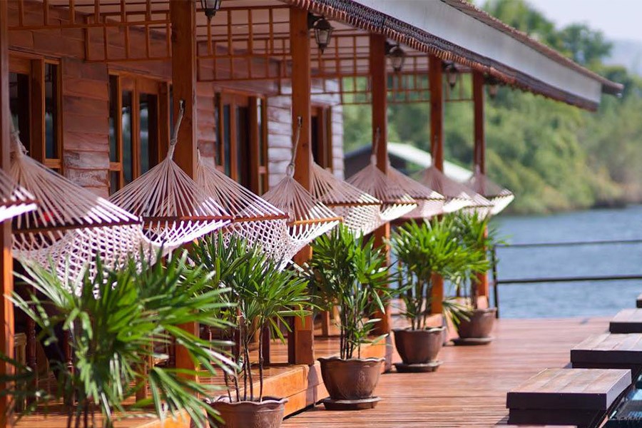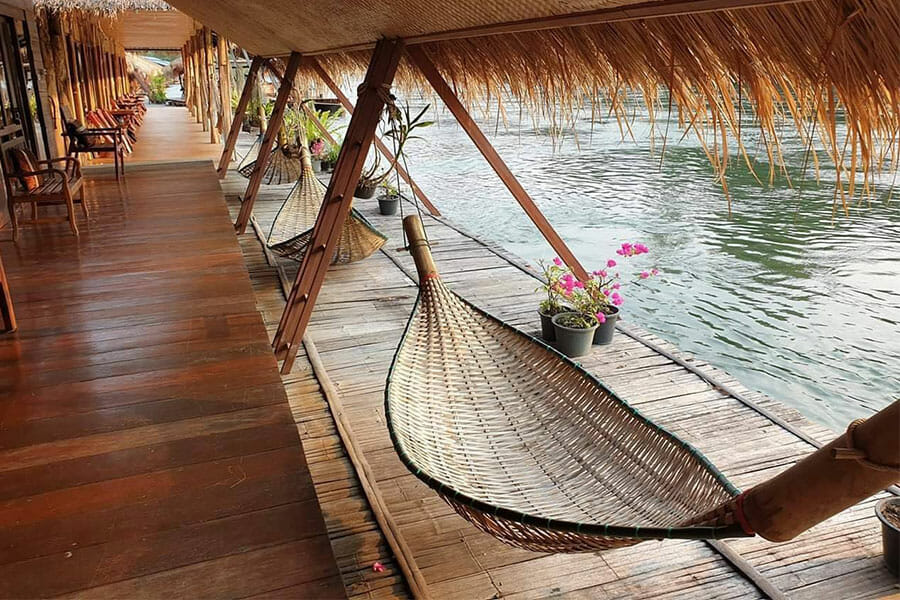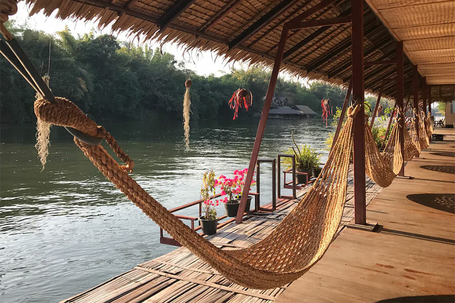 Sweet Garden River Kwai Resort ที่พักบนเรือนแพสุดชิลล์ริมแม่น้ำ ให้คุณได้สัมผัสอากาศธรรมชาติ ที่หน้าห้องพักทุกห้องมีเปลให้นอนชิลล์ นอนชมวิว นอนอ่านหนังสือ นอนฟังเพลง ในบรรยากาศดีๆ ริมแม่น้ำ ที่นี่ยังมีสระว่ายน้ำบนเนินเขาที่สามารถเห็นวิวโค้งน้ำที่สวยงาม ใครอยากเพิ่มความโรแมนติกแนะนำให้รอดูพระอาทิตย์ที่กำลังจะตกในช่วงเย็น และความพิเศษคือที่ Sweet Garden River Kwai Resort คุณสามารถสั่งหมูกระทะมากินเพิ่มความฟินกันได้อีกด้วย