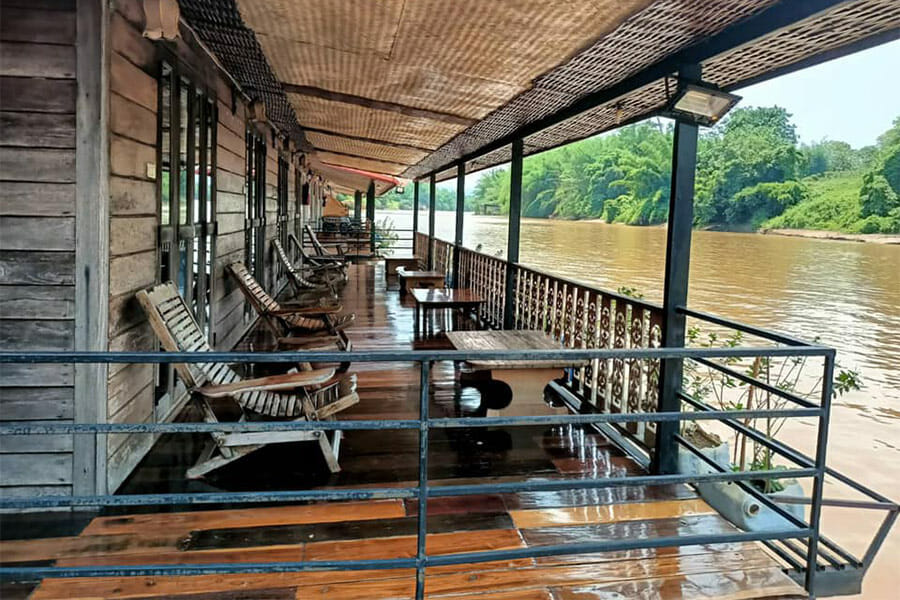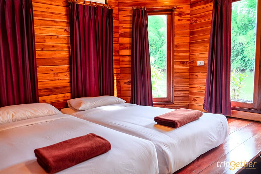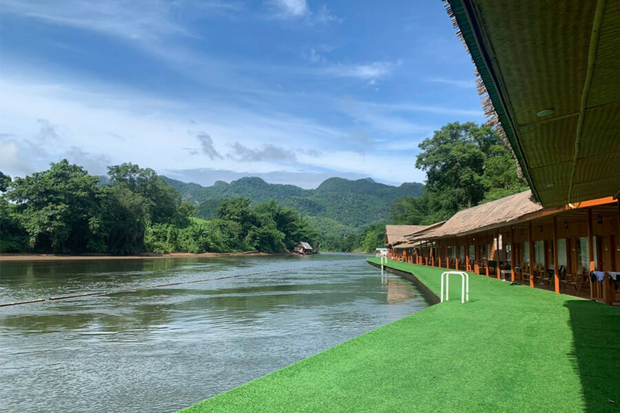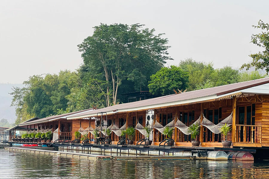 Khaothone Riverview Resort รีสอร์ทเรือนแพริมแม่น้ำ ที่ตกแต่งให้เข้ากับธรรมชาติ อยู่ไม่ไกลจากน้ำตกไทรโยคน้อย และสถานนีรถไฟน้ำตก ที่พักมีทั้งแบบแพลอยน้ำและที่พักริมน้ำให้ได้เลือก ทั้งหมด 3 แบบ คือ SuperIor river raft ริมแพน้ำ, Deluxe cottage วิวภูเขา และ Superior pool view วิวสระว่ายน้ำ ใครเข้าพักแบบแพริมความพิเศษคือสามารถลงเล่นน้ำเย็นๆ ว่ายน้ำชิลล์ จากระเบียงหน้าที่พักได้เลย หรือใครอยากทำกิจกรรมที่ Khaothone Riverview Resort มีกิจกรรมให้เลือกทำเยอะมากไม่ว่าจะเป็นปั่นจักรยาน, ปิงปอง, สนุ๊กเกอร์, เปตอง, แบตมินตัน, ล่องแพเปียกชมธรรมชาติ, พื้นที่สำหรับตกปลา, เล่นน้ำในสระว่ายน้ำ,ชมฝูงกวางดาว หรือนั่งช้าง ก็สามารถแจ้งกับทางที่พักได้เลย
