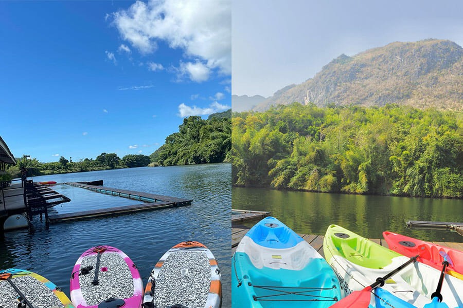 Kangtai Camp รีสอร์ทสไตล์แพริมน้ำ นอนชิลล์ท่ามกลางธรรมชาติ แพที่พักเป็นบ้านไม้ด้านหน้าเป็นวิวภูเขาเขียวขจีและสายน้ำแควที่ทำให้รู้สึกสดชื่น ด้านหน้าห้องพักยังมีเปลญวนสีขาว และเปลตาข่าย ให้นั่งเล่น นอนชิลล์ดื่มด่ำบรรยากาศแสนสงบท่ามกลางธรรมชาติด้วย ใครที่ชื่นชอบกิจกรรมทางน้ำที่พักมีทั้งล่องแพเปียก พายคายัค และพายซับบอร์ด ให้ได้เลือกเล่นกันอย่างเต็มที่ ที่สำคัญใครเป็นสายถ่ายรูปเช็คอินที่ Kangtai Camp มีมุมให้ถ่ายรูปทั้งที่ฝั่งได้จัดมุมไว้ให้ถ่ายกันอย่างจุกๆ และที่แพริมน้ำก็มีมุมถ่ายรูปเยอะไม่แพ้กันรับรองว่าได้รูปเยอะจุใจแน่นอน