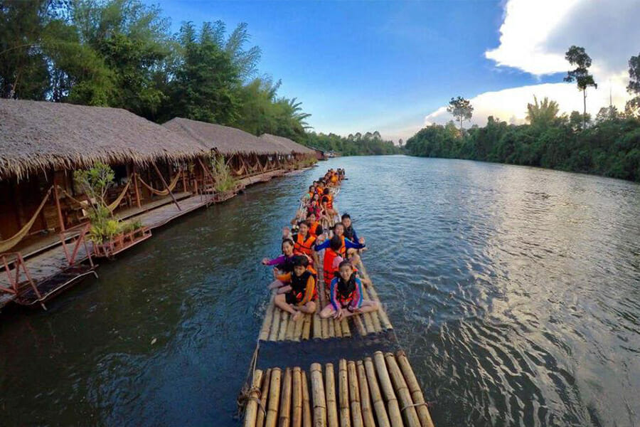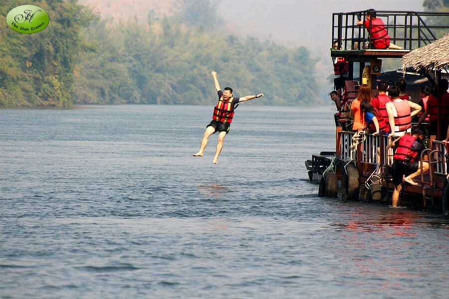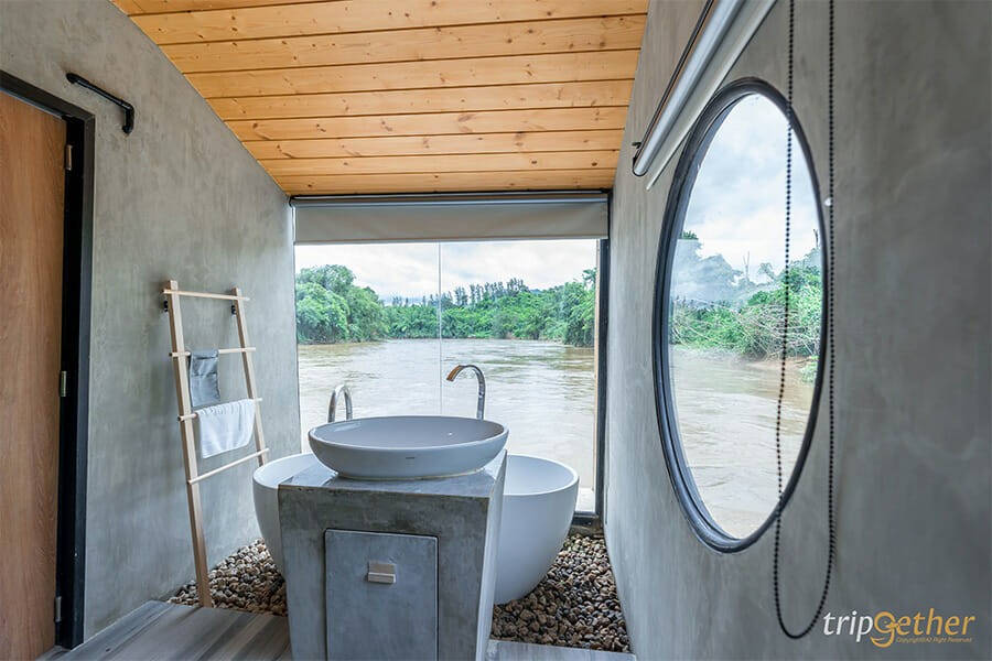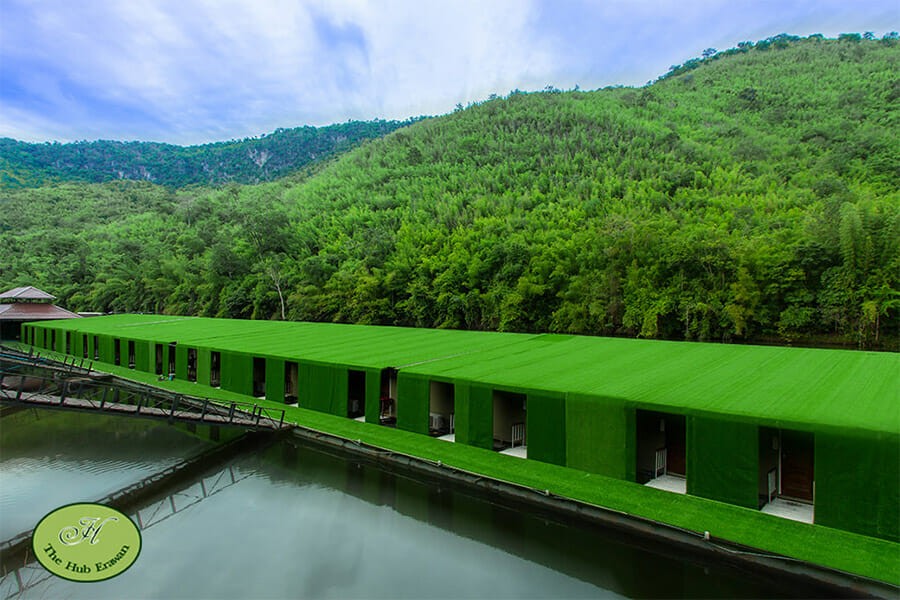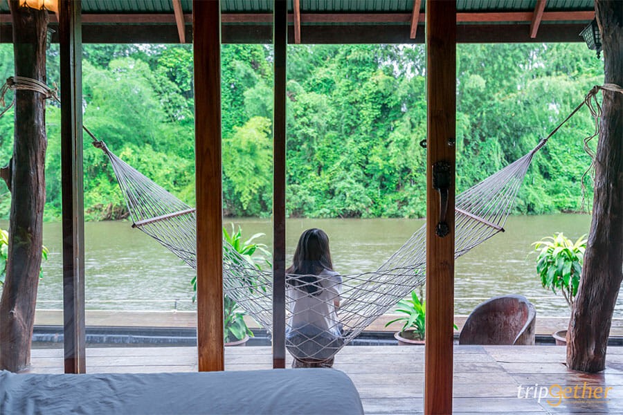 The HUB Erawan Resort ที่พักวิวธรรมชาติริมแม่น้ำแควใหญ่ สไตล์บาหลี มีทั้งแบบที่พักบนแพและบ้านพักบนฝั่งให้ได้เลือกเข้าพัก ที่พักบนแพในแบบส่วนตัวสุดๆ พร้อมอ่างอาบน้ำให้คุณได้แช่น้ำไปชมวิวแม่น้ำแควใหญ่ไปด้วยอย่างฟินๆ จะนั่งเอาเท้าจุ่มน้ำเพิ่มความสดชื่น หรือจะลงเล่นน้ำเย็นๆ ในแม่น้ำทางที่พักก็เตรียมบันไดลงน้ำไว้ให้แล้วในทุกห้อง ถ้าใครสนใจในช่วงเย็นที่ The HUB Erawan Resort มีกิจกรรมล่องแพชมวิวแม่น้ำ ธรรมชาติ และชมพระอาทิตย์ตกด้วย
