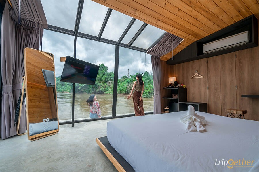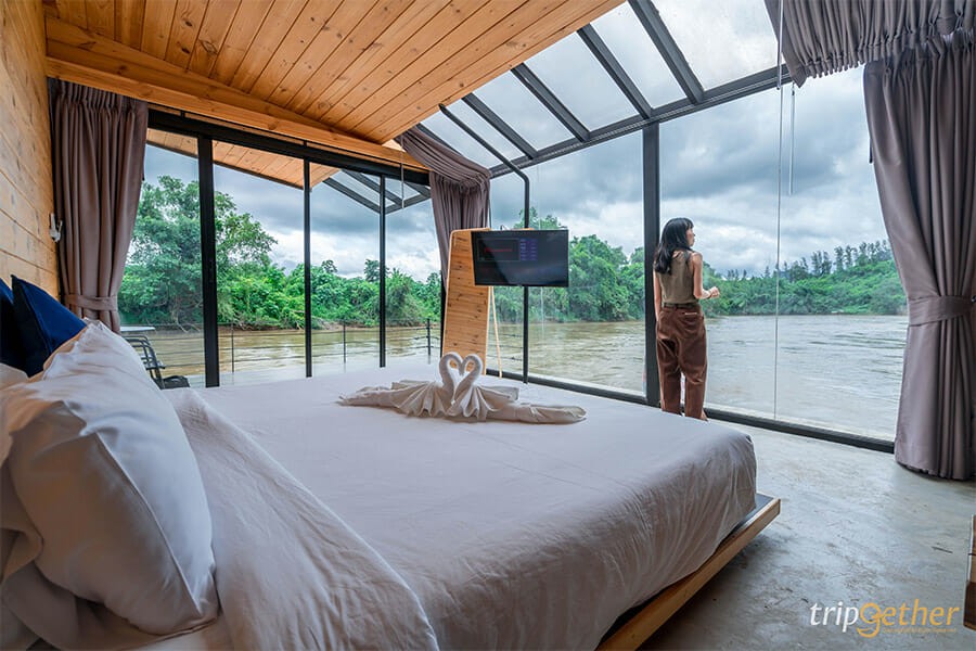 The Tryst River Kwai รีสอร์ทริมแม่น้ำแควน้อย ท่ามกลางธรรมชาติ ที่พร้อมต้อนรับคุณในทุกการเดินทางไม่ว่าจะมากับคนรัก มากับเพื่อน หรือจะมาเป็นครอบครัว เพราะที่นี่มีห้องพักให้เลือกถึง 9 แบบ แบ่งออกเป็นบ้านบนแพ 5 แบบ คือ Panoramic River Vibe, River Vibe, Panoramic River Scene, River Scene, Panoramic River Scene (Pool View) และห้องพักบนฝั่ง 4 แบบ คือ River Scape,-Panoramic Pool Garden, Pool Garden, See Through ซึ่งห้องพักแต่ละห้องมีเอกลักษณ์สุดพิเศษที่แตกต่างกันออกไปบางห้องมีสระว่ายน้ำส่วนตัว บางห้องเป็นแบบวิวพาโรนามา บางห้องมีอ่างอาบน้ำ ไปเลือกพักกันได้ตามสไตล์คุณ