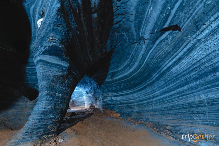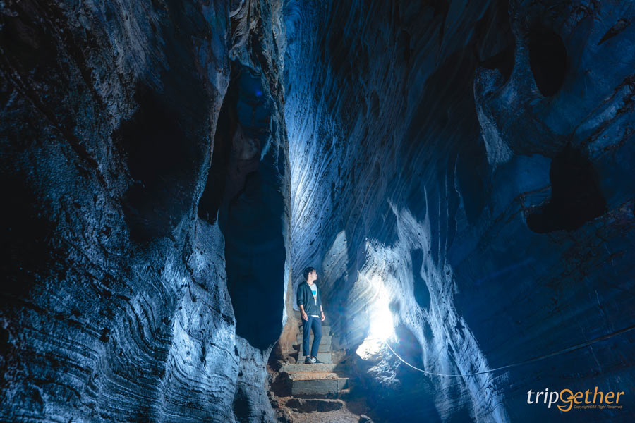 ถ้ำสีฟ้า ตั้งอยู่ภายในสำนักสงฆ์ถ้ำพระ จ.ตาก จะพบว่าผนังของถ้ำมีลายเป็นสีฟ้าอ่อนๆ สลับเทาสมชื่อถ้ำสีฟ้า เกิดจากแร่แคลไซต์ ภายในถ้ำมีหินงอกหินย้อย และลวดลายสีฟ้าสวยงามชัดเจน และมีโพรงหินเป็นอุโมงค์คล้ายงวงช้าง ถือเป็นไฮไลท์ที่หลายคนเข้ามาถ่ายรูปอีกด้วย เมื่อเดินเข้าไปภายในโถงถ้ำ จะมีพระพุทธรูปนอนศิลปะเมียนมา และพระพุทธรูปสีขาวให้นักท่องเที่ยวได้มากราบไหว้สักการะเพื่อความสิริมงคลอีกด้วย
