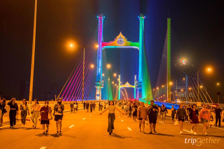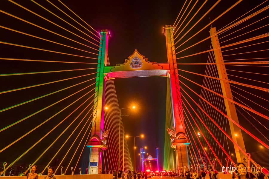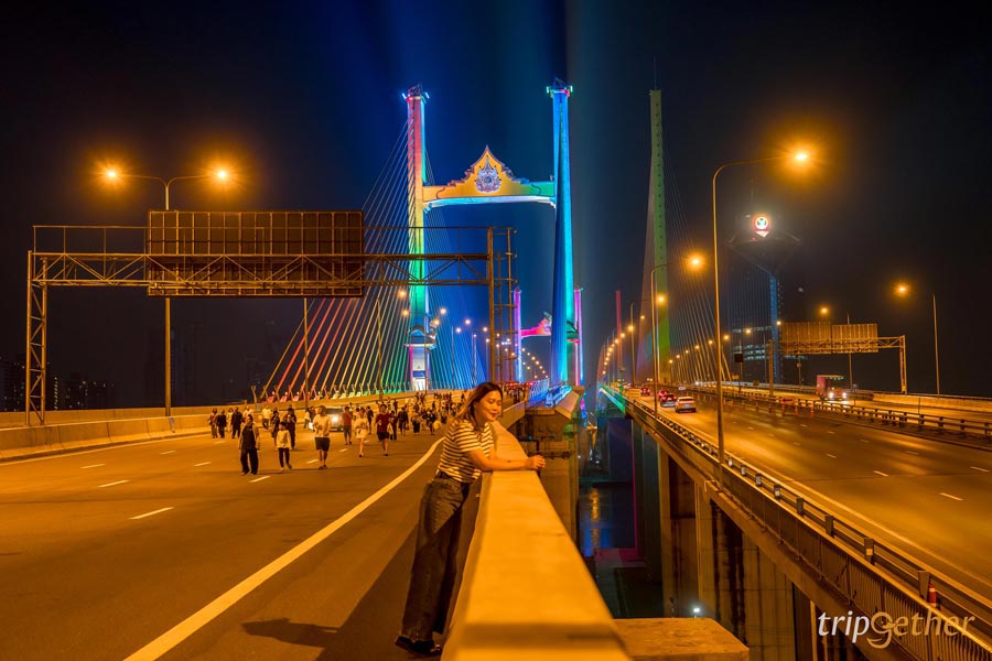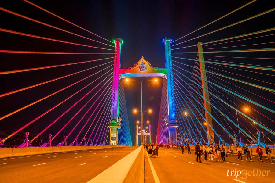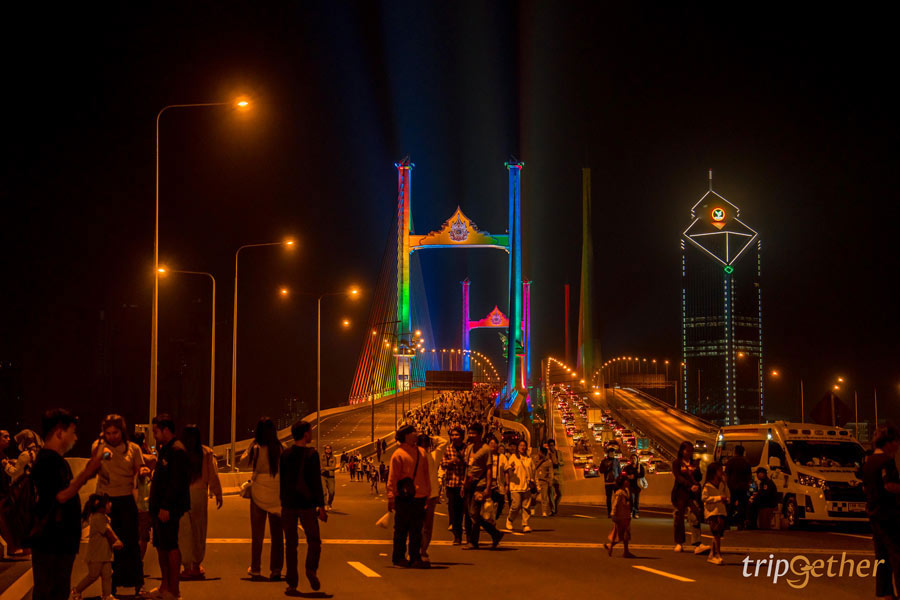 สะพานพระราม 10 หรือสะพานทศมารัน สะพานข้ามแม่น้ำเจ้าพระยาที่กว้างที่สุดในประเทศไทย สร้างเพื่อเป็นส่วนหนึ่งของทางด่วน พระราม 3 – ดาวคะนอง – วงแหวนฯ ตะวันตก เชื่อมต่อกับทั้งทางด่วนศรีรัช และเฉลิมมหานคร โดยมีช่องจราจร 8 เลน เปิดใช้งานเมื่อต้นปี พ.ศ.2568 นี่เอง (ภาพสะพานพระราม 10 ในงานเฉลิงฉลองการเปิดสะพานพระราม 10 ในงาน “มหกรรมสุขเต็มสิบ” เมื่อวันที่ 29 มกราคม 2568)