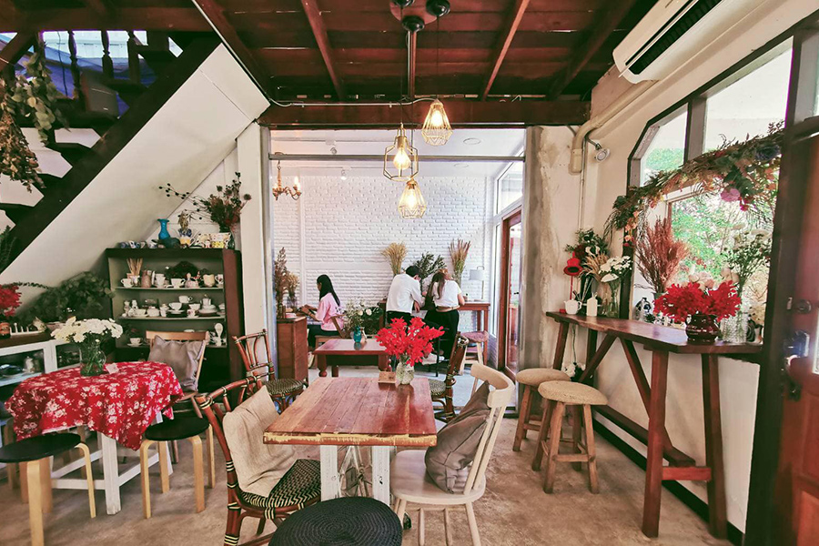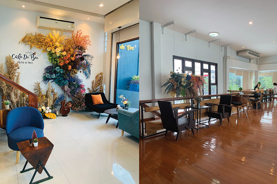 ปิดท้ายกันที่ คาเฟ่ เดอ บี (Cafe de Bee) คาเฟ่ที่มาพร้อมบรรยากาศสบายๆ ด้วยการตกแต่งร้านสไตล์โมเดิร์น เติมแต่งร้านด้วยดอกไม้แห้งและดอกไม้สดหลากชนิดให้ภายในร้านสดชื่นมากยิ่งขึ้น สำหรับใครที่อยากนั่งจิบเครื่องดื่มแบบเงียบสงบก็สามารถขึ้นไปชิลล์ที่บริเวณชั้น 2 ร้านได้อีกด้วย ในส่วนของเมนูมีให้เลือกเพียบทั้ง อเมริกาโน่น้ำผึ้ง คาราเมลลาเต้ ชาเขียวเย็น Lime Lemon Honey ลาเต้เย็น ครัวซองต์ แพนเค้กนุ่มราดน้ำผึ้งฉ่ำ ไก่ทอด และ Set ปังปิ้งสังขยา+ชาไทย ที่รับรองเลยว่าใครได้รับประทานแล้วเป็นต้องแวะกลับมาชิลล์ซ้ำอีกอย่างแน่นอน