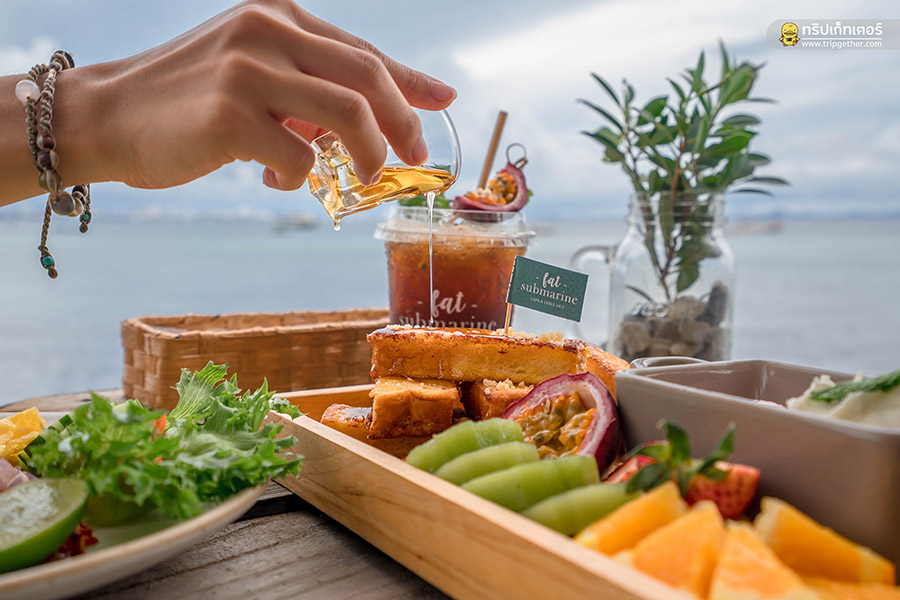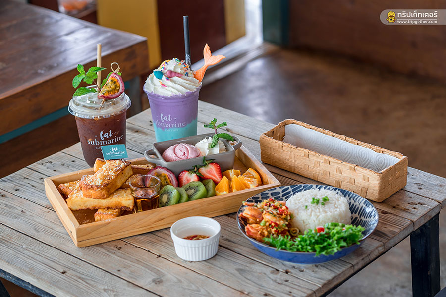 Fat Submarine Cafe & Chillout คาเฟ่เก๋ๆ ริมทะเลสุดชิคกับโลเคชั่นที่ดีต่อใจเหลือเกิน ตัวร้านตั้งอยู่ที่ตลาดหน้าวัดเกาะล้าน เดินทางจากท่าเรือหน้าบ้านมาที่ร้านได้เพียง 5 นาที ภายในร้านตกแต่งเรียบง่าย เน้นเฟอร์นิเจอร์ไม้ผสมผสานกับความมินิมอล บวกกับโทนสีสันสดใสเข้ากันได้ดีกับท้องทะเล มุมเด็ดของร้านที่พลาดไม่ได้คือเปลนอนชิลล์มองทะเลฟินๆ แถมได้รูปสวยกลับไปอีกด้วย มาถึงร้านแล้วแนะนำให้สั่ง ข้าวกุ้งผัดพริกเกลือ และ ข้าวขยุ้มปลาทู & ไข่เจียว ด้านของหวานต้องลอง French Toast serve with fruits & ice-cream, Submarine Signature Coffee และ Under The Sea Mermaid Milk