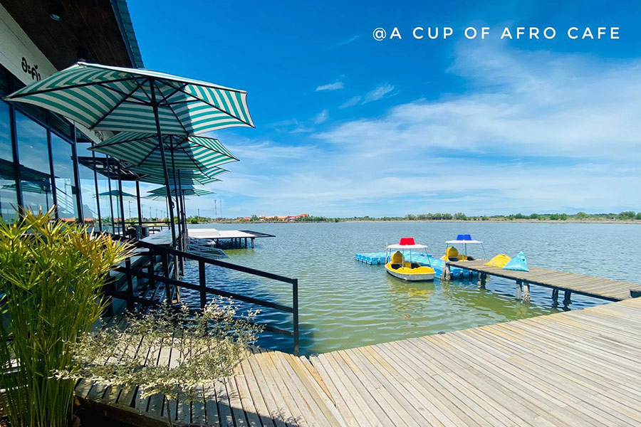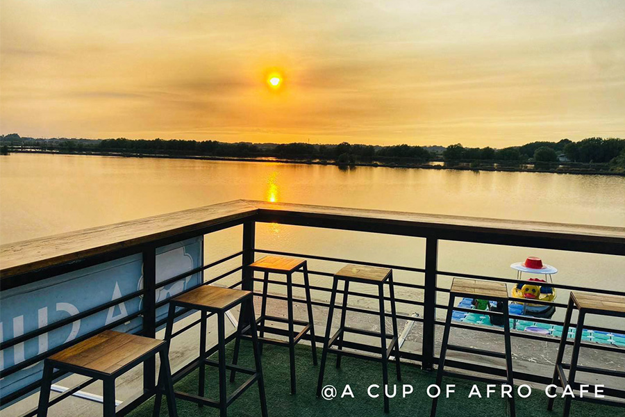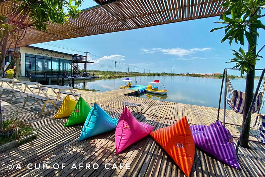 A Cup of Afro Cafe คาเฟ่บรรยากาศดีลมเย็น ตั้งอยู่บางขุนเทียน-ชายทะเล ที่ให้ความรู้สึกเหมือนนั่งจิบกาแฟอยู่ริมทะเลสาบ ในบรรยากาศชิลล์ๆ ตัวร้านมีที่นั่งทั้งโซนห้องแอร์ และโซนด้านนอกริมน้ำ มีมุมให้เดินเล่นถ่ายรูปมากมาย หรือใครอยากปั่นเรือเป็ดชมวิวทางร้านก็มีเตรียมให้ได้ปั่นกันอย่างเพลินๆ แอบกระซิบว่าถ้าใครมาช่วงเย็นจะได้เห็นบรรยากาศสวยๆ ของพระอาทิตย์ตกดินอีกด้วย ส่วนของเมนูมีทั้งเครื่องดื่มชา กาแฟ เบเกอรี่ บิงซู ไอศกรีม และอาหารจานเดียว ให้ได้เลือกอิ่มท้องกันมากมาย