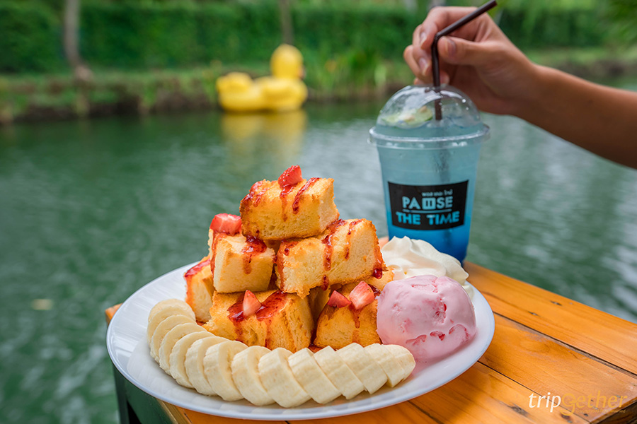 Pause The Time คาเฟ่ที่ขอพาทุกคนมาพักเวลาช่วงสั้นๆ ดื่มด่ำกับบรรยากาศสุดชิลล์แบบกรีนๆ ที่บ้านแพ้วจังหวัดสมุทรสาคร ในบริเวณร้านนอกจากจะเต็มไปด้วยต้นไม้แล้วยังมีสระน้ำที่ให้ความสดชื่นด้วย หรือใครอยากพายเรือเล่นทางร้านมีเรือให้ได้พายกันด้วย ส่วนของโซนที่นั่งกินอาหาร กินขนม ดื่มเครื่องดื่มนั้น มีตั้งแต่ที่นั่งในห้องแอร์เย็นๆ และโซนด้านนอกทั้งที่เทอเรสริมสระน้ำ และที่ซุ้มริมสระน้ำ ด้านเมนูที่ Pause The Time มีทั้งอาหารไทย และอาหารสไตล์ฟิวชั่น รวมไปถึงของหวาน และเครื่องดื่มให้เลือกหลายเมนู ใครเป็นสายนั่งชิลล์กินของอร่อยๆ ดื่มด่ำบรรยากาศดีๆ ต้องมาให้ได้