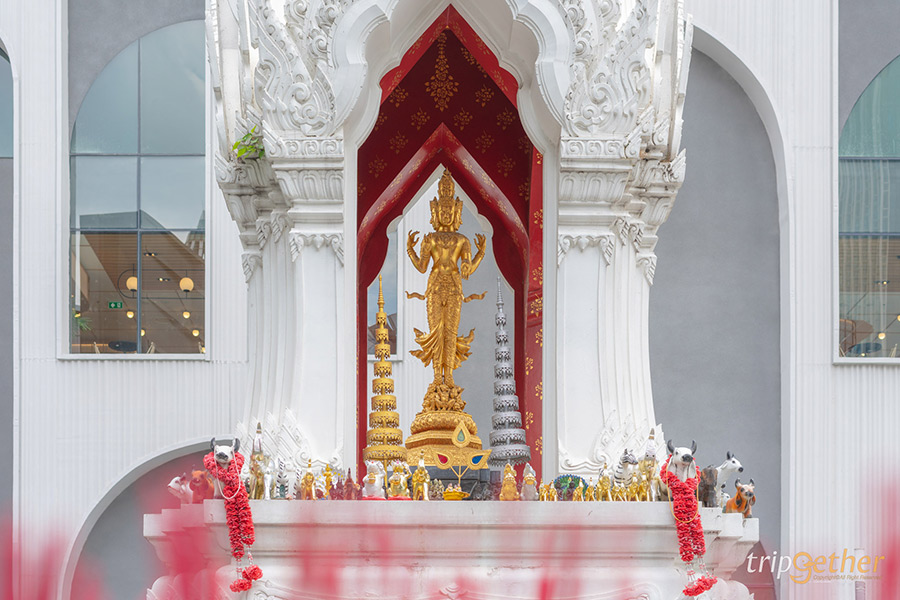 “เทวีทรงสิริโฉม ผู้ประทานความสมบูรณ์ทั้งทรัพย์สินและความสำเร็จ” พระแม่ลักษมี เป็นเทวีที่ถือว่ามีพระสิริโฉมที่งดงามที่สุดในบรรดาเทวีในจักรวาล ทรงเป็นพระชายาของพระนารายณ์ หนึ่งในองค์มหาเทพที่เป็นพระตรีมูรติ หนึ่งในความงดงามของพระแม่ลักษมีคือสีชมพูกลีบบัว ที่ทรงถือไว้ในพระหัตถ์ทั้งสอง และพระหัตถ์อีกข้างหนึ่งทรงโปรยเหรียญทองไหลลงมา ซึ่งเป็นสัญลักษณืแห่งโชคลาภ ความร่ำรวย และความสมบูรณ์นั่นเอง การเดินทางยังเทวรูปพระแม่ลักษมีสามารถเข้ามาในศูนย์การค้าเกษรวิลเลจที่ชั้น 4 โดยจะมีป้ายบอกทางอยู่เป็นระยะ