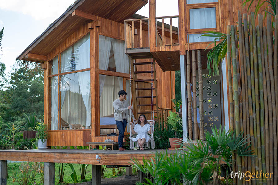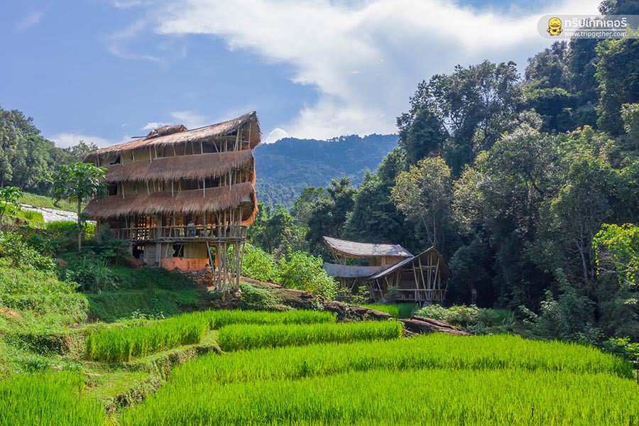บ้านไม้ไผ่ยักษ์ เอาใจผู้ที่ชื่นชอบธรรมชาติ กับที่พักที่ทำจากไม้ไผ่ทั้งหลัง สูงขนาด 3 ชั้น ถูกออกแบบมาในสไตล์บาหลีผสมผสานกับธรรมชาติในพื้นที่ได้อย่างลงตัว ภายในที่พักมี 2 ห้องนอน 2 ห้องน้ำ รองรับได้ 10 คน ผู้เข้าพักต้องจองล่วงหน้าทุกครั้ง เนื่องจากที่นี่เขารับนักท่องเที่ยวแค่วันละหนึ่งกรุ๊ปเท่านั้นน มาพักสองคนก็ได้บ้านทั้งหลังไปเลย เป็นส่วนตัวสุดๆ แถมยังได้สูดอากาศบริสุทธิ์ท่ามกลางภูเขาและทุ่งนาขั้นบันไดที่รายล้อมรอบบริเวณที่พัก มีลมเย็นๆ พัดตลอดเวลา กลางคืนก็นอนฟังเสียงน้ำจากลำธารไหลเอื้อยๆ เรียกว่าเป็นความเงียบสงบและเป็นอีกหนึ่งตัวเลือกที่ดีเลยทีเดียว