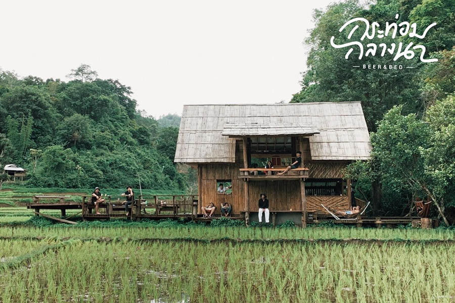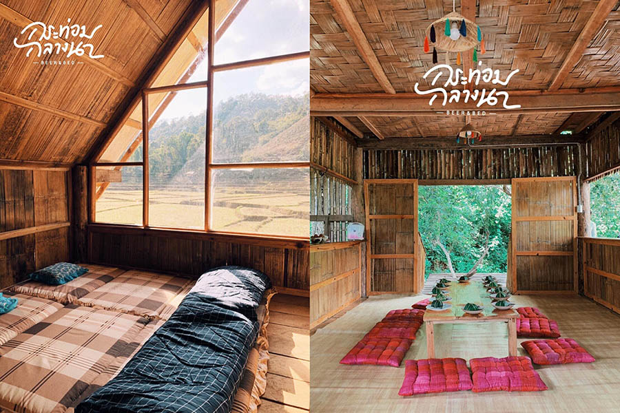 กระท่อมกลางนา ที่พักกระท่อมไม้ไผ่สองชั้น ด้านหลังตัวบ้านมีลำธารเล็กๆ ไหลผ่าน บริเวณรอบบ้านรายล้อมด้วยทุ่งนาและวิวเขา โดยห้องพักแบ่งเป็น 2 ห้องนอน ที่สามารถชมวิวได้ต่างกัน คือวิวนาข้าวและวิวลำธาร ยามค่ำคืนยังได้เพลินเพลินไปกับกิจกรรมรอบกองไฟ พร้อมจิบเครื่องดื่มเด็ดๆ จากที่พักไว้คลายหนาวได้เป็นอย่างดี อีกทั้งตัวบ้านมีอ่างแช่น้ำให้ฟีลลิ่งเหมือนอยู่ใน pool villa กลางนาเก๋ๆ นอกจากนี้ยังมีมุมพักผ่อน ทั้งที่นั่งและเปลไว้ให้นอนอ่านหนังสือชมบรรยากาศวิวภูเขาและท้องนา รวมถึงมีกิจกรรมต่างๆ ไม่ว่าจะเป็น พาทัวร์หมู่บ้านปกาเกอะญอ พาไปดูทะเลหมอกที่จุดชมวิว และดริปกาแฟในยามเช้า ได้มาพักที่นี่บอกเลย ทั้งสงบและฟิวกู๊ดมากๆ