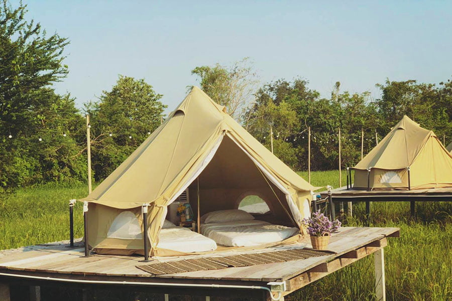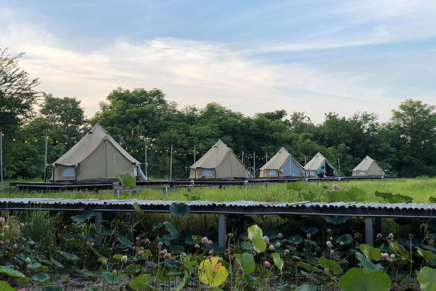 หอมกลิ่นย่า คาเฟ่ แอนด์ แคมป์ ที่พักสวยสไตล์แคมป์ปิ้งชิคๆ อยู่ไม่ไกลแค่อยุธยาเดินทางชิลล์ๆ ก็ได้ไปนอนเต็นท์แคมป์ถ่ายรูปกับท้องทุ่งนาสวยๆ ได้ไม่เหมือนใคร แถมที่นี่ยังมีคาเฟ่ให้แวะไปนั่งจิบกาแฟได้อีกด้วย เต็นท์กระโจมที่นี่มีทั้งหมด 5 หลังตั้งเรียงรายกลางท้องทุ่งนาภายในเพียบพร้อมด้วย ที่นอน, หมอน, ผ้าห่ม, มุ้ง, ปลั๊กไฟ, ผ้าขนหนู, แอร์ และโคมไฟ ในส่วนของห้องน้ำมีบริการเป็นแบบห้องน้ำรวมแยกชายและหญิง เรียกได้ว่าการมาเที่ยวพักผ่อนที่ได้ครบทั้งที่พักนอนเต็มอิ่มแถมมาด้วยเช็คอินคาเฟ่ชิคๆ ในบรรยากาศสบายเที่ยวครบจบในที่เดียวจริงๆ