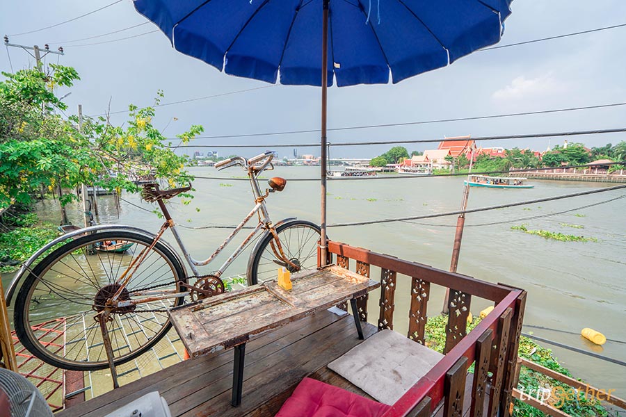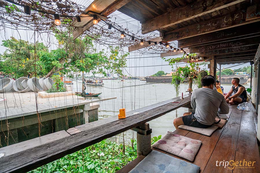 ยกเย็นขึ้นบก ร้านอาหารที่ได้รีโนเวทจากบ้านหลังใหญ่ ที่ยังคงกลิ่นอายความวินเทจได้เป็นอย่างดี แถมโลเคชั่นก็ยังดีสุดๆ เพราะตั้งอยู่ติดริมแม่น้ำเจ้าพระยา ภายในร้านก็ตกแต่งได้อย่างน่ารัก มีมุมชิลล์ๆ ให้นั่งห้อยขา พร้อมรับประทานอาหารแบบเพลินๆ โดยมีเมนูให้เลือกสั่งทั้งเมนูอาหารคาวและขนมหวานเลยทีเดียว