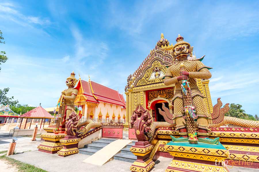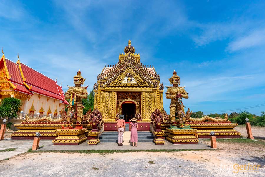 และไม่ไกลจากวนอุทยาน เราขับรถมาอีกประมาณ 600 เมตร เพื่อเข้ามากราบไหว้สิ่งศักดิ์สิทธิ์ที่ วัดเขากะโหลก วัดสวยประจวบคีรีขันธ์ ที่เที่ยวปราณบุรี โดดเด่นด้วยวิหารสีทองอร่ามสวยงาม ด้านหน้ามียักษ์ 2 ตน เฝ้าตรงประตูวัดเพื่อป้องกันสิ่งไม่ดีไม่ให้เข้ามาภายในวัดได้