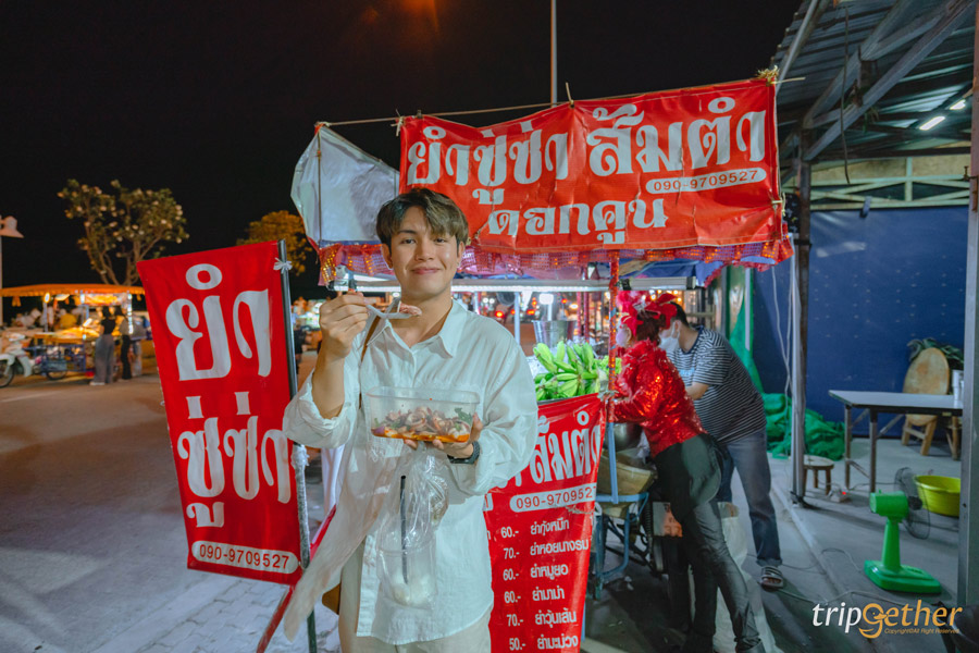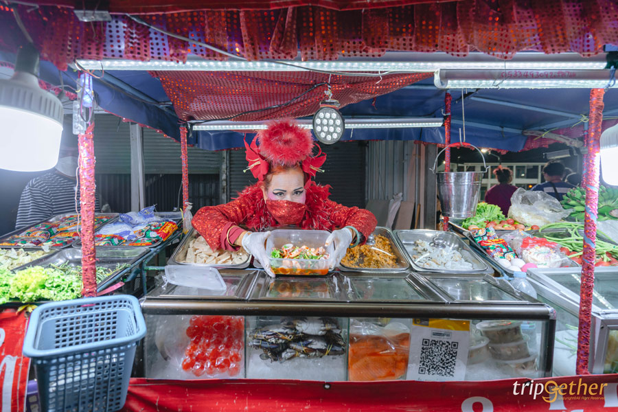 เดินได้สักพักก็มาหยุดอยู่ที่ร้านยำ ยืนหนึ่งเรื่องความปัง เพราะแม่ค้าแต่งตัวแซ่บมาก จัดเต็มความอลังการแบบสุดๆ
