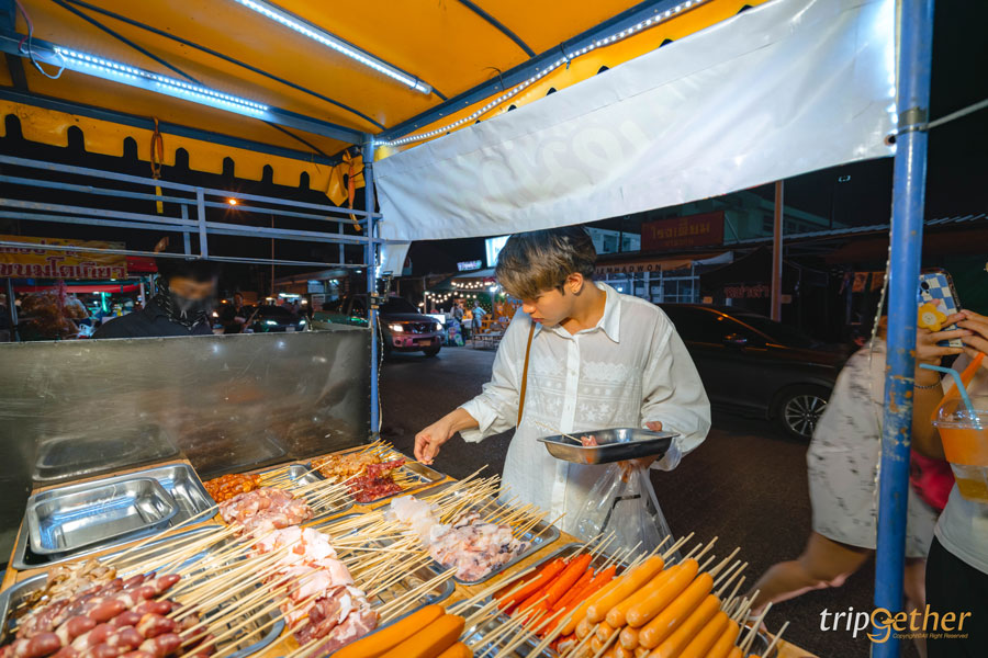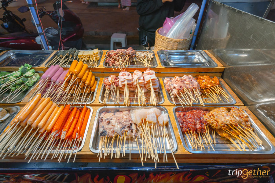 ร้านแรกมาจอดกับร้านบาร์บีคิว บอกเลยว่าของมีให้เลือกเยอะมาก ทั้งหมู ไก่ สามชั้น หรือใครที่ไม่ชอบหอมกับพริกทางร้านก็มีหมูล้วน กับเครื่องในให้ด้วย