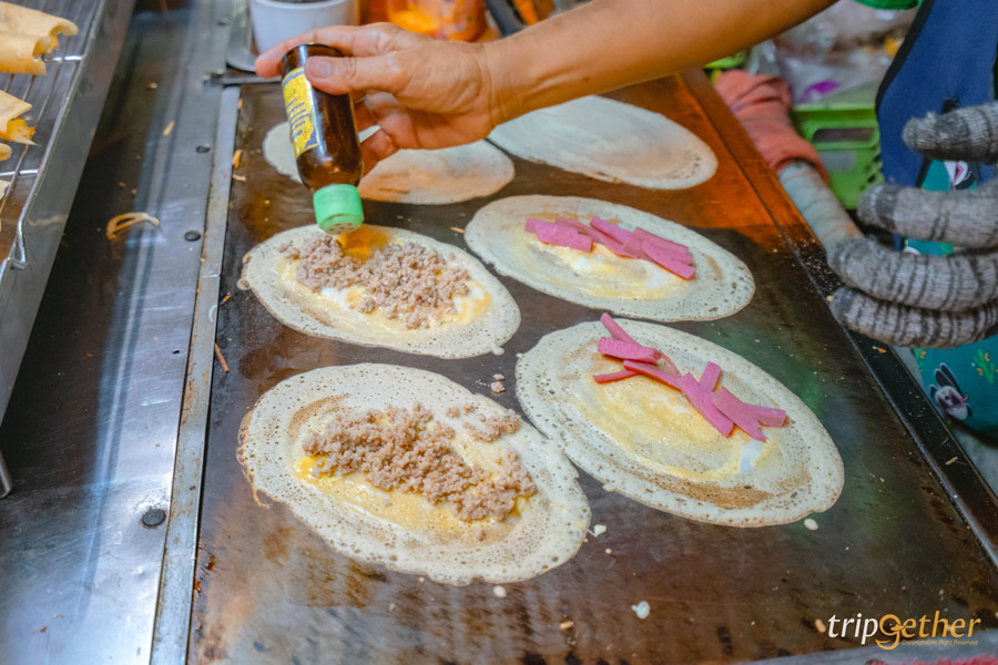 ปิดท้ายด้วยของหวานฉ่ำๆ อย่างขนมโตเกียว ชิ้นใหญ่ชิ้นโตอลังการมากๆ ชิ้นละ 10 บาท มีให้เลือกทั้งไส้หวาน ไส้เค็มอย่างไส้กรอก หมูสับ แม่ค้าทำสดๆ ใหม่ๆ วางขายแบบชิ้นต่อชิ้นกันเลยทีเดียว