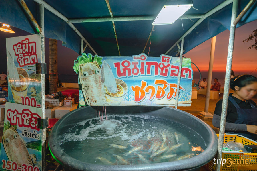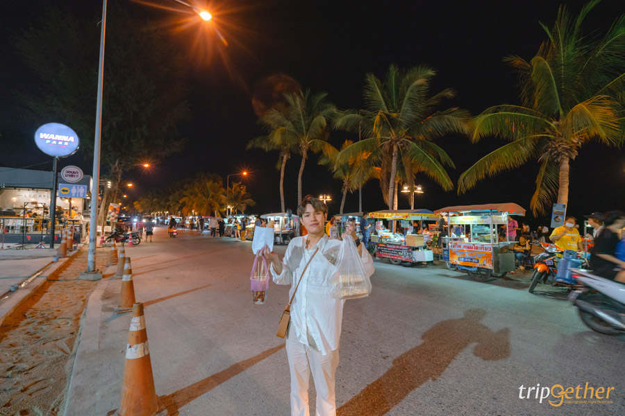 ได้ของกินแล้วก็สามารถเดินหาที่นั่งริมหาดได้เลย ซึ่งนั่งได้ทั้งที่นั่งที่มีบริการ หรือถ้าใครอยากนั่งพื้นก็จะมีร้านบริการเช่าเสื่อให้ นั่งได้กันยาวๆ เลย บรรยากาศดีมากๆ ลมพัดสบายๆ มีเพลงให้ฟัง ใครที่กลัวว่าจะมาไม่ทัน ไม่ต้องกังวลไปเพราะสตรีทฟู้ด เริ่มขายกันตั้งแต่ 5 โมงเย็น ยาวไปจนถึงตี 3 กันเลยทีเดียว ออกจากกรุงเทพช่วงเย็นก็ยังทันจ้า