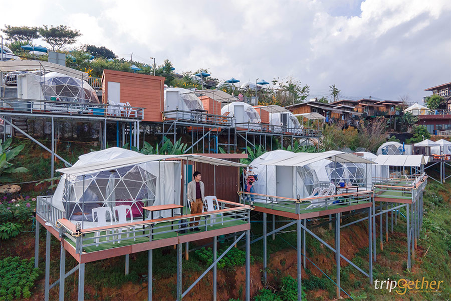 ที่พักที่สามารถนอนมองทะเลหมอกแบบชิลล์ๆ ได้จากเตียงนอน ไร่ภูพญา ตั้งอยู่ท่ามกลางหุบเขา ถูกโอบล้อมด้วยธรรมชาติสุดกรีน ไม่ว่าจะมองไปทางไหนก็พบกับต้นไม้สีเขียวให้ความรู้สึกผ่อนคลายและสบายตาในวันพักผ่อนเป็นที่สุด บอกเลยว่าจากที่พักสามารถมองวิวธรรมชาติได้แบบ 360 องศา ไฮไลท์อยู่ในช่วงฤดูฝนและฤดูหนาวที่สามารถเห็นทะเลหมอกเต็มๆ ตาแบบไม่มีอะไรมาขว้างกัน แถมช่วงกลางคืนยังนอนดูดาวได้แบบโรแมนติกสุดๆ ส่วนของที่พักไร่ภูพญามีให้เลือกถึง 2 แบบ คือ Dome Tent เต็นท์แบบส่วนตัวที่รองรับได้ 2 – 3 คน และ Family Tent เต็นท์ที่พักสำหรับ 4 คน แน่นอนว่าเต็นท์ทุกหลังมาพร้อมสิ่งอำนวยความสะดวกครบครันเข้าพักได้สบายสุดๆ แอบกระซิบว่าที่พักยังมีร้านอาหารในไร่ และลานนั่งกินหมูกระทะวิวยอดดอยเปิดให้บริการด้วย ใครหาที่พักที่ครบจบทั้งที่นอนและที่กินแนะนำมาเช็คอินที่ไร่ภูพญากันเลย