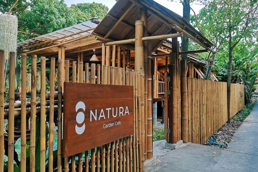 Natura Garden Cafe คาเฟ่ในสวนลิ้นจี่ ย่านธนบุรี โดดเด่นด้วยความร่มรื่นของสวนสีเขียวของพื้นที่ภายในร้าน อบอวนไปด้วนต้นไม้สูงใหญ่ สลับกับตัวร้านที่ออกแบบมาในแนวญี่ปุ่นโดยเน้นใช้ไม้ไผ่เป็นวัสดุหลัก ทำให้บรรยากาศโดยรวมของที่นี่ดูเป็นธรรมชาติจริงๆ เหมาะจะมานั่งจิบกาแฟในวันหยุด หรือชวนเพื่อนมานั่งพักผ่อนหย่อนใจ ก็ดูสบายตาสบายใจไม่น้อย ด้านเมนูอาหารมีทั้งคาวหวาน รองรับได้ทั้งมื้อหลักมื้อรอง โดยจะมีเมนูแนะนำคือ ผัดไทย, ข้าวแกงมัสมั่น, ข้าวเหนียวมะม่วง, เค้กเลม่อน, อัญชัญกาแฟ และลิ้นจี่อเมริกาโน่ ผ่านมาฝั่งธนก็แวะเข้ามากันได้นะครับ