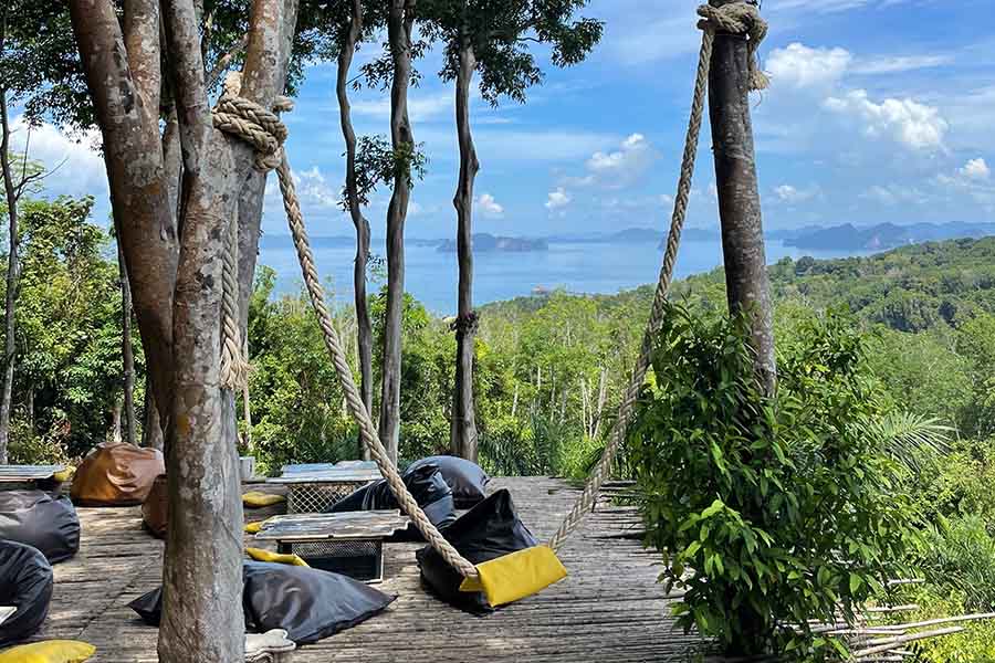 เขาทองฮิลล์ คาเฟ่ที่มีวิวสวยเป็นอันดับต้นๆ ของจังหวัดกระบี่ ถือเป็นสถานที่ยอดนิยมของนักท่องเที่ยวและคนในพื้นที่ เป็นจุดชมวิวที่ใครก็ไม่ควรพลาด ตัวร้านตั้งอยู๋บนเนินเขาโดยออกแบบมาในสไตล์บาหลี โดยเน้นโครงสร้างให้โปร่ง โล่ง เพื่อให้ลมสามารถพัดผ่านเข้ามาได้ตลอดทั้งวัน อีกทั้งทำให้คนที่อยู่ภายในร้านสามารถมองเห็นวิวได้อย่างชัดเจน นอกจากนี้ยังมีมุมถ่ายรูปเยอะ บอกเลยคนชอบถ่ายรูปต้องหลงรัก สำหรับใครที่ท้องหิวที่นี่ก็มีบริการทั้งอาหารและเครื่องดื่มมากมายให้เลือกรับประทาน สวย ครบขนาดนี้ ต้องมาเที่ยวสักครั้ง