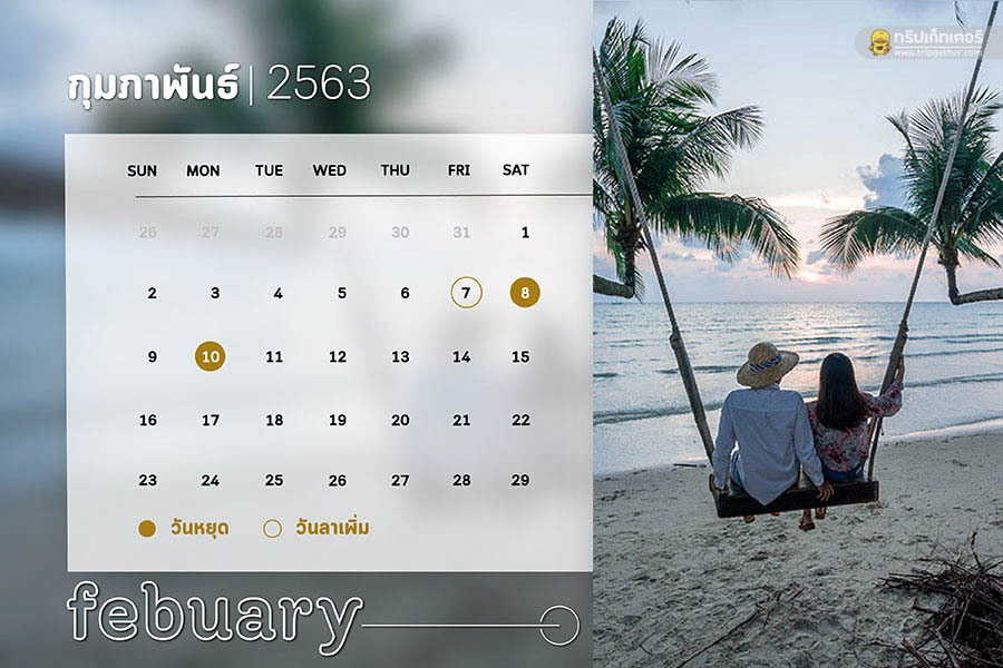 เดือนแห่งความรักแบบนี้ต้องพากันไปเที่ยวสวีทเติมความหวานกันในสถานที่สุดโรแมนติกอย่าง การไปนั่งดินเนอร์ริมทะเล หรือไปนอนฟินชมวิวขุนเขาได้จากปลายเตียง ก็ให้บรรยากาศชวนฝันได้ดีเหมือนกัน และช่วงเดือนนี้ก็ยังคงมีอากาศหนาวอยู่บ้างก็ลองหาสถานที่ไปสัมผัสความหนาวกันได้แบบไม่ต้องไปไหนไกลกรุงเทพมากนัก เนื่องด้วยวันหยุดเดือนนี้อาจจะมีเวลาน้อยในการไปท่องเที่ยวจึงต้องหาที่พักใกล้ๆ กรุงเทพกันดูบ้างก็ไม่เสียหายอะไร หากใครกำลังวางแผนพาแฟนไปเซอร์ไพรส์วันเกิด วันครบรอบแต่งงาน หรือฉลองวันแห่งความรักแบบนี้ การลาหยุดไปเที่ยวในเดือนนี้ก็ถือว่าเหมาะเลยทีเดียว แต่ก็ควรจัดสรรวันลาให้ดีนะไม่งั้นจะกลับมาทำงานไม่ทัน หรืออาจจะต้องโดนเจ้านายด่าเอาได้