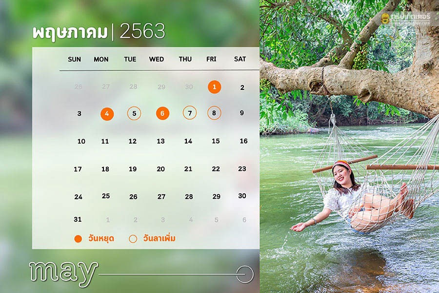 เดือนพฤษภาคมแบบนี้ก็ยังต้องสัมผัสกับอากาศร้อนหน่อยนะ แต่ก็มีวันหยุดและสามารถลาได้มากที่สุดถึง 10 วันเลยทีเดียว ลองหาเวลาไปเที่ยวน้ำตก ล่องแพ หรือนอนที่พักริมธารน้ำเย็นชุ่มฉ่ำหัวใจกันดูอย่างจังหวัดนครนายก เดินทางง่ายๆ ได้แบบไม่ต้องไปไกลกรุงเทพมากนัก หรือจะไปล่องแพชิลล์ๆ ที่กาญจนบุรี ทริปเก็ทเตอร์ก็มีที่พักมาให้เลือกมากมายเลยแหละ แต่หากใครไม่ได้อยากไปนอนไกลๆ ก็ลองไปนั่งกินลมชมวิวกันที่ร้านอาหารริมน้ำแบบไม่ไกลกรุงดูบ้างก็ไม่เสียหายนะ แล้วค่อยกลับมานอนทิ้งตัวสบายๆ อยู่ที่บ้านก็ได้ฟีลดีเหมือนกัน สำหรับใครที่มีงบไม่มากแต่อยากนอนพักผ่อนสงบๆ มีความเป็นส่วนตัวหน่อยพร้อมพูลวิลล่าดีๆ ให้นอนแช่ตัวคลายร้อนก็ลองเดินทางไปจังหวัดไม่ไกลกรุงเทพอย่าง หัวหิน จังหวัดประจวบคีรีขันธ์ อัมพวา พัทยา รับรองแค่นี้ก็ได้ชาร์จแบตสบายใจแน่นอน