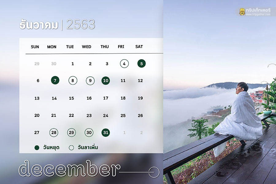 สิ้นปีแบบนี้มีใจไปเที่ยวสุดๆ เพราะมีวันหยุดเยอะพอสมควร เหมาะแก่การวางแผนเที่ยวสุดๆ สามารถเที่ยวได้มากสุดตั้ง 9 วันเลยนะ แบบนี้ต้องจัดทริปเที่ยวให้หายเหนื่อยกันหน่อยแล้ว ยิ่งเป็นฤดูหนาวมีอากาศเย็นสบายแบบนี้แล้วละก็น่าไปนอนดูทะเลหมอกจากปลายเตียงคงฟินน่าดู แต่ถ้าเป็นสายล่าหมอกอยู่แล้วขอแนะนำให้ไปเขาค้อกันเลย เพราะเป็นสถานที่ท่องเที่ยวที่สามารถชมทะเลหมอกได้ทั้งปีเลยทีเดียวเชียวแหละ หรือใครอยากไปแถวๆ อีสานก็ต้องไปสัมผัสวิถีชีวิตสโลว์ไลฟ์ใช้ชีวิตสบายๆ ที่เชียงคานก็ฟินนะ ไปนอนริมแม่น้ำโขงที่เชียงคานมีที่พักให้เลือกเพียบอีกทั้งยังได้ทำบุญตักบาตรข้าวเหนียวยามเช้าอีกด้วย ตอนเย็นก็ไปเดินถนนคนเดินเชียงคานได้บรรยากาศดีไปอีกแบบ แต่ถ้าชอบเดินป่าขึ้นเขาไปจัดแคมป์ปิ้งบนดอยก็มีเพียบทั้ง ม่อนจอง จ.เชียงใหม่ เขาสันหนอกวัว จ.กาญจนบุรี อุทยานแห่งชาติภูกระดึง จ.เลย และอุทยานแห่งชาติภูสอยดาวก็บรรยากาศดีไม่แพ้อุทยานแห่งชาติอื่นๆ เลย